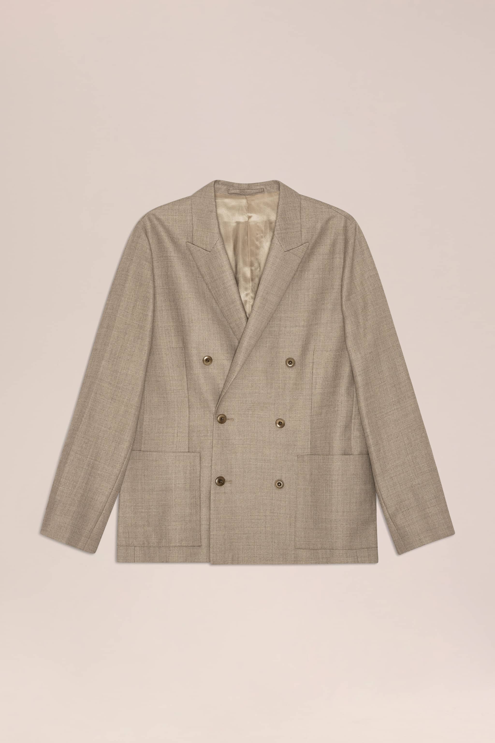 Tailored double-breasted blazer designed with a refined silhouette, crafted from a luxurious blend of wool and linen.