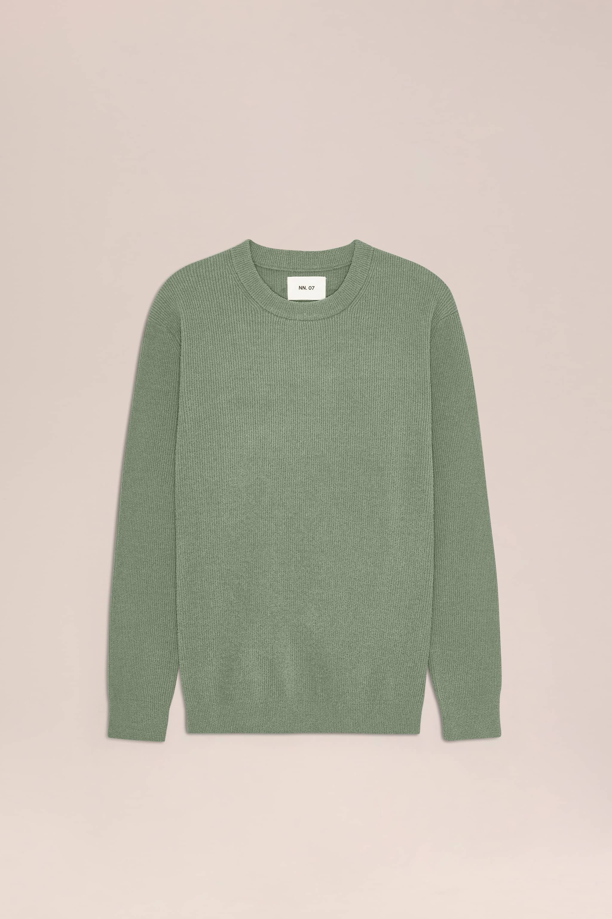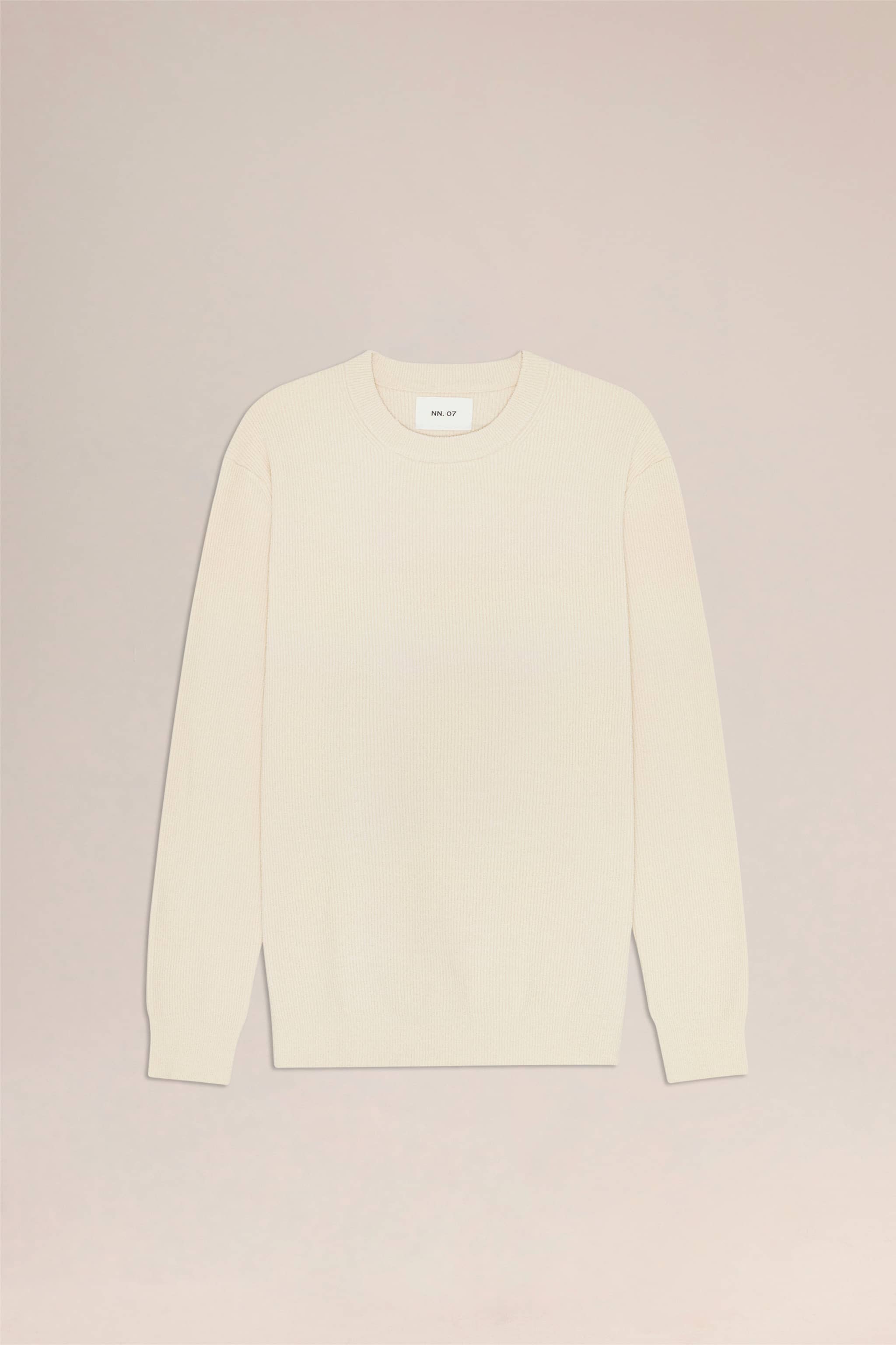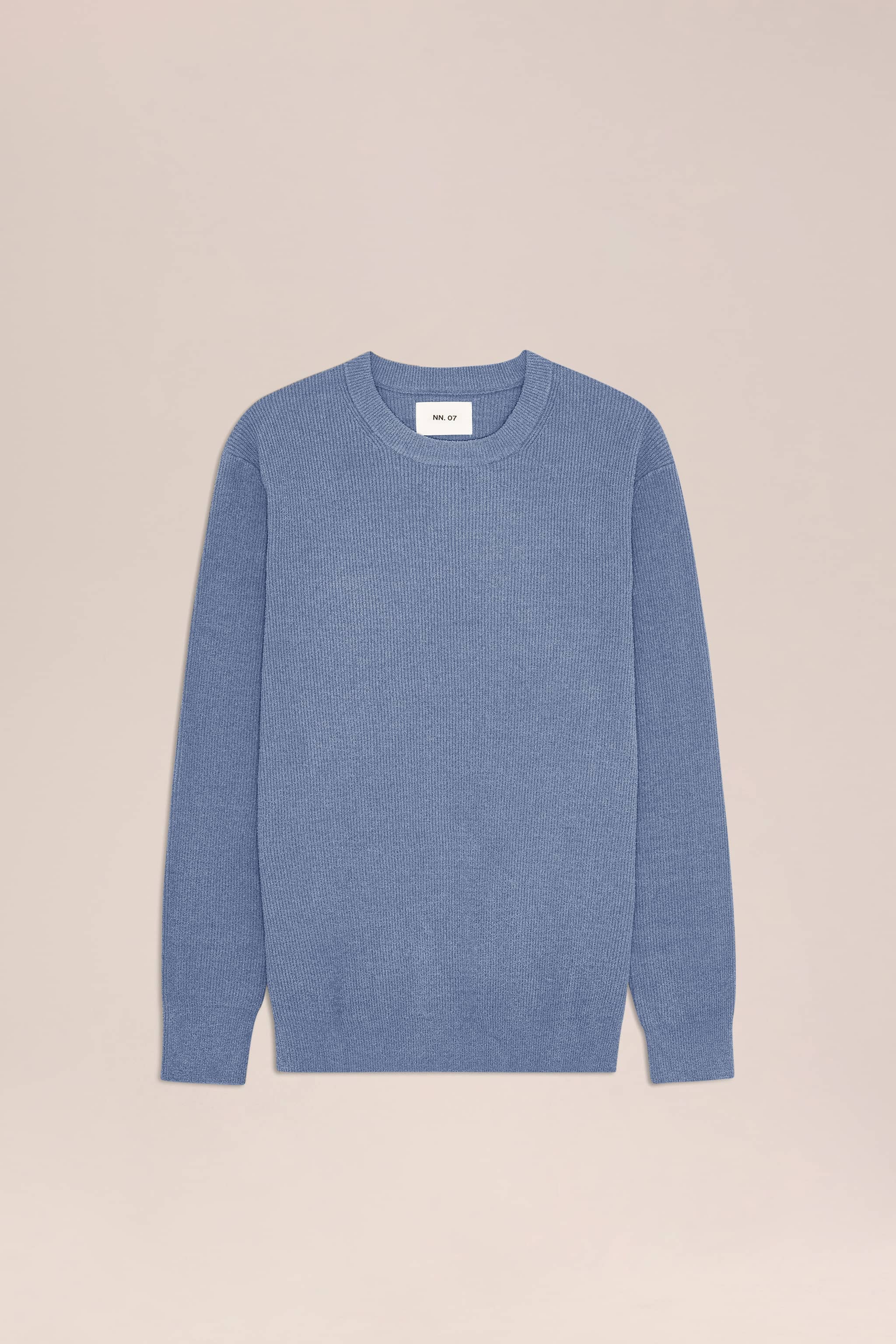 The Mikkel HQ Crew is a relaxed-fit, rolled-edge crewneck sweater. Knitted in intarsia, it features a naive yet charming depiction of the NN.07 headquarters in Copenhagen.