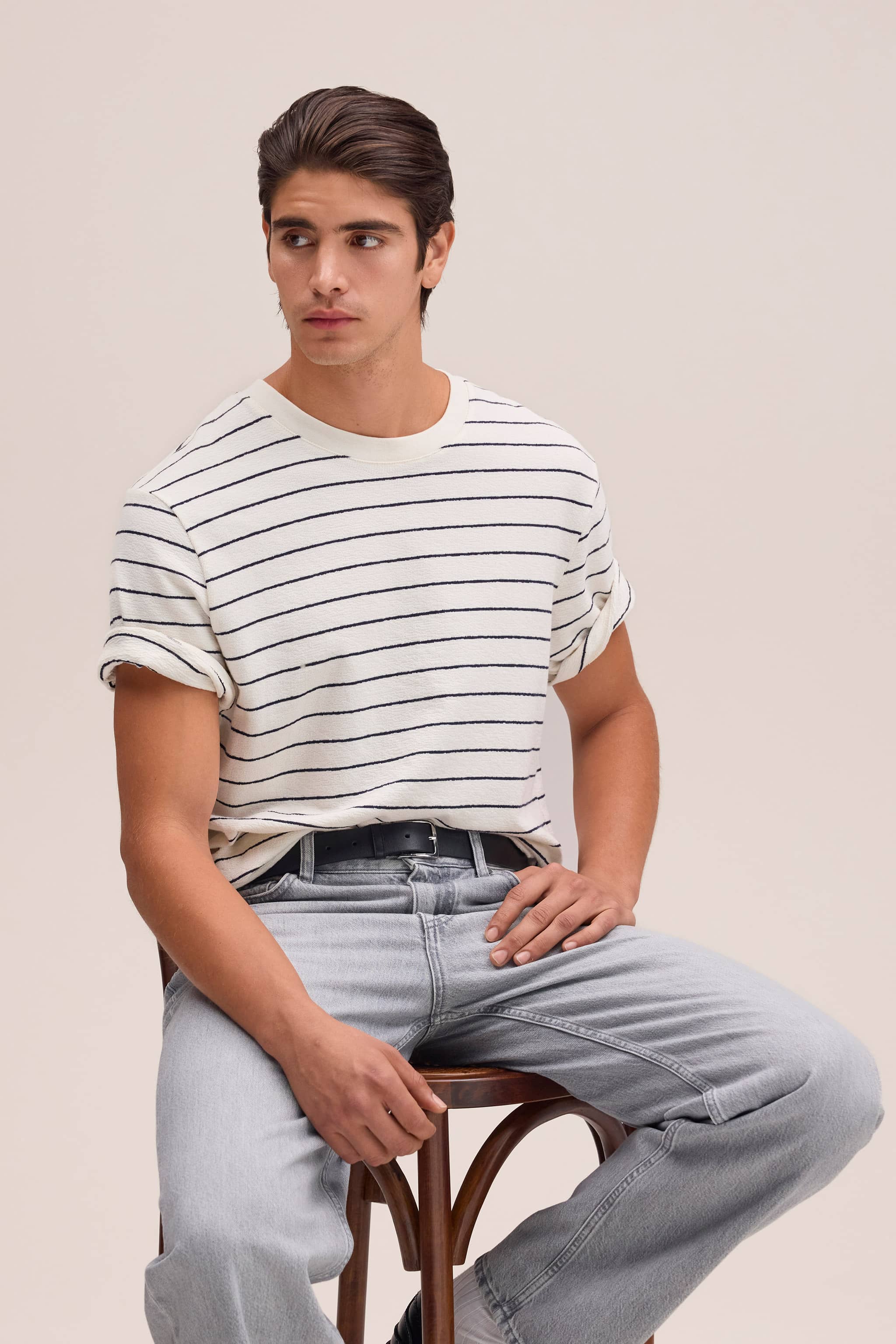 T-shirt constructed in a yarn-dyed striped crepe jersey that provides a crinkled texture and distinctive pebble-like handfeel.
