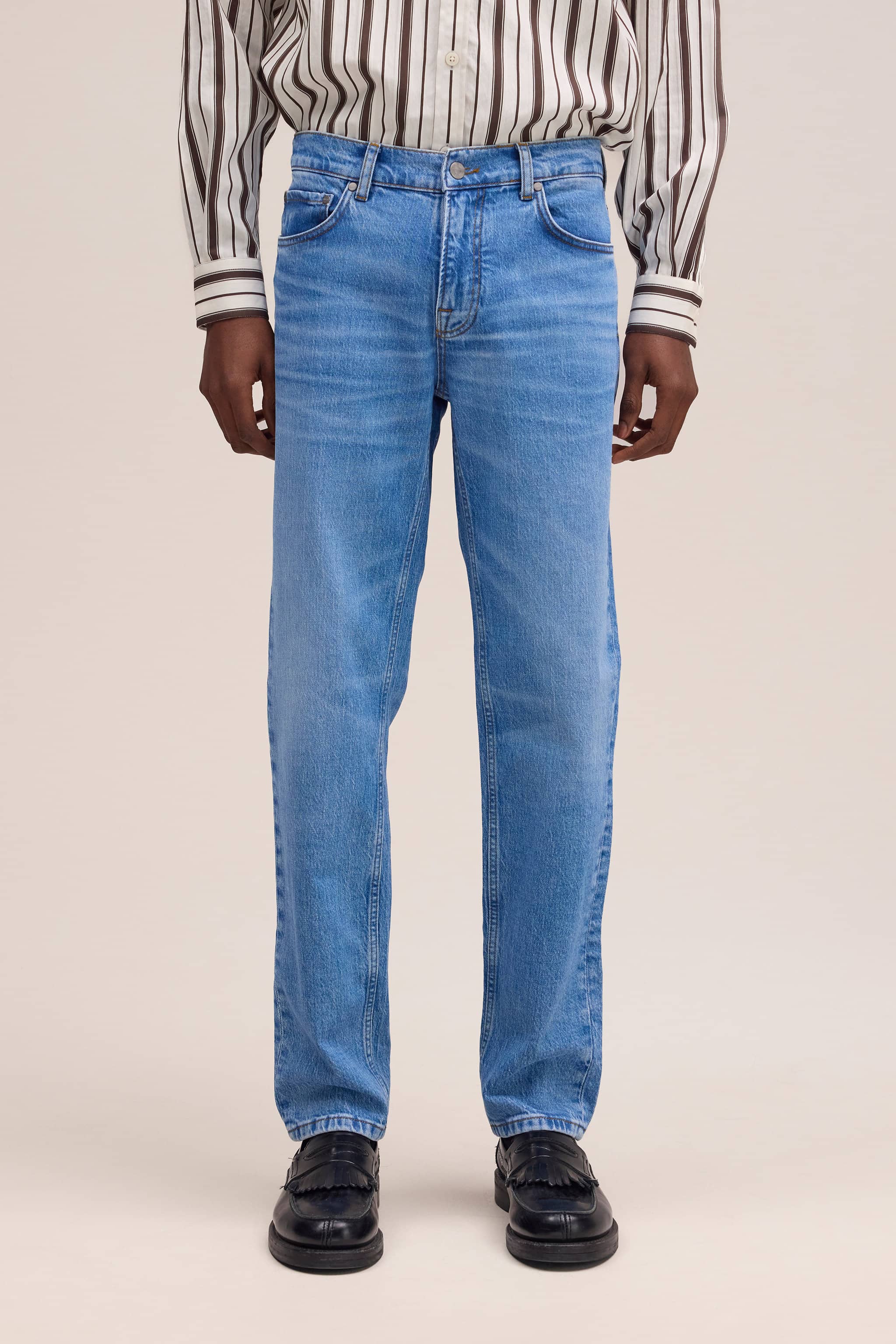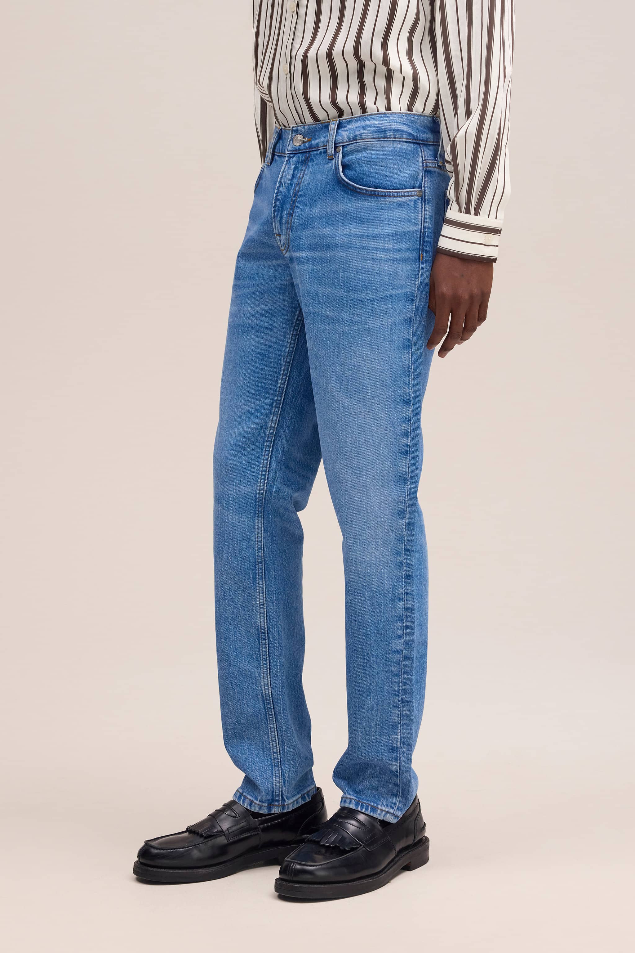 Slim-fitted, five-pocket jeans crafted from 12,75 oz organic cotton denim with a slight touch of stretch. Made with whiskering details and finished with a blue embroidery stitching along the back pocket.