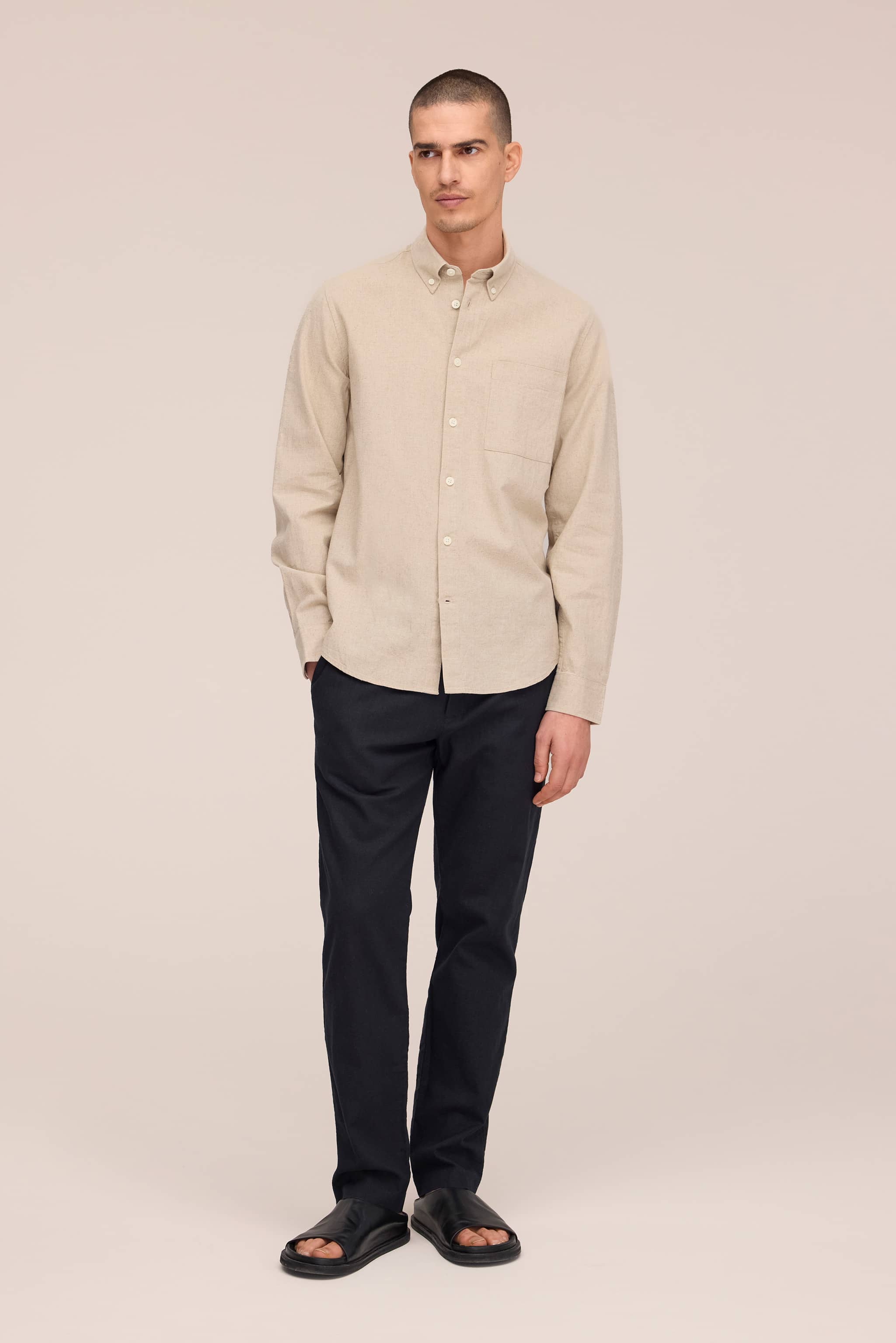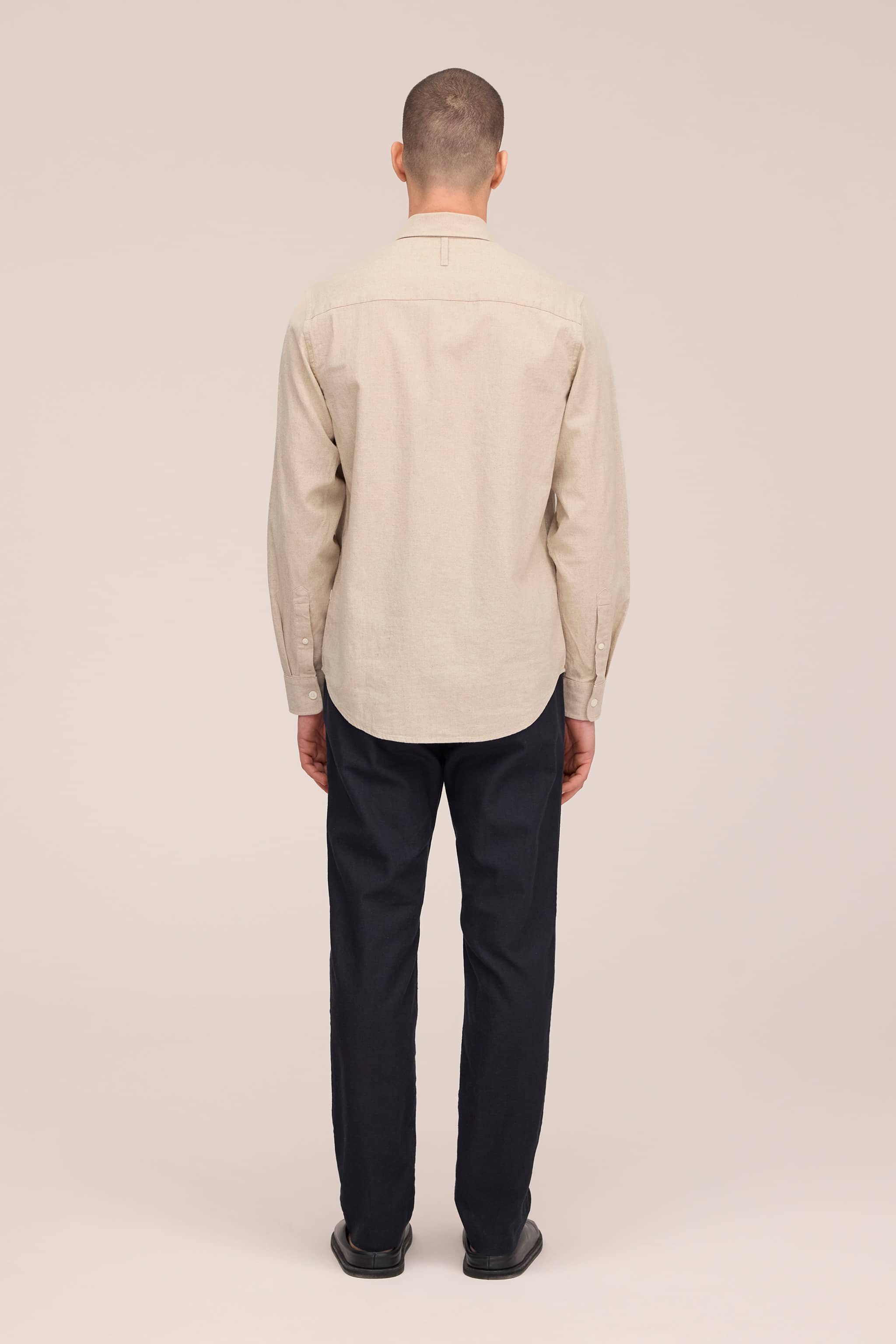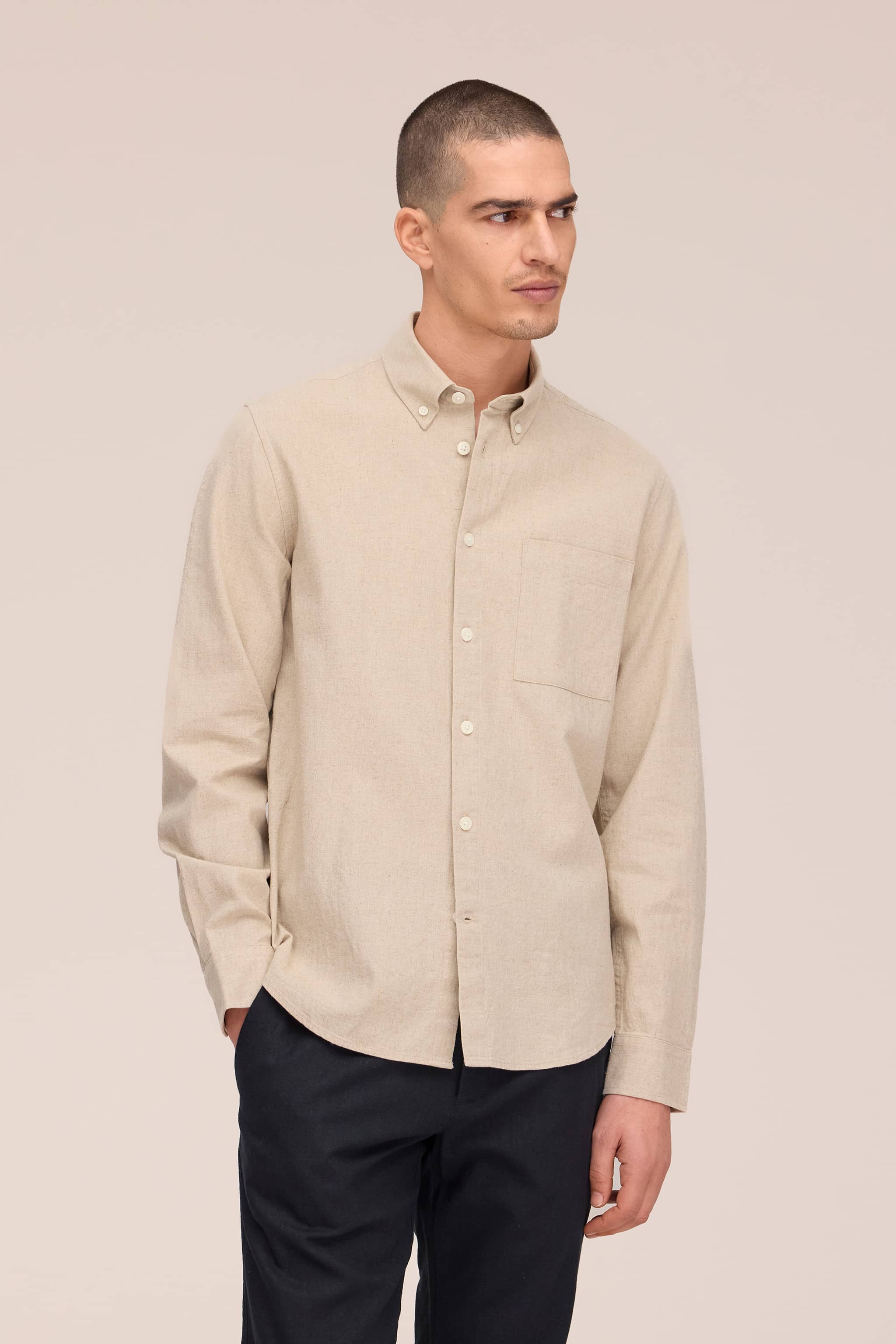 Long-sleeved button-down shirt made from a breathable cotton and linen blend. Designed with a square chest patch pocket, buttoned cuffs, and branded NN07 logo buttons.