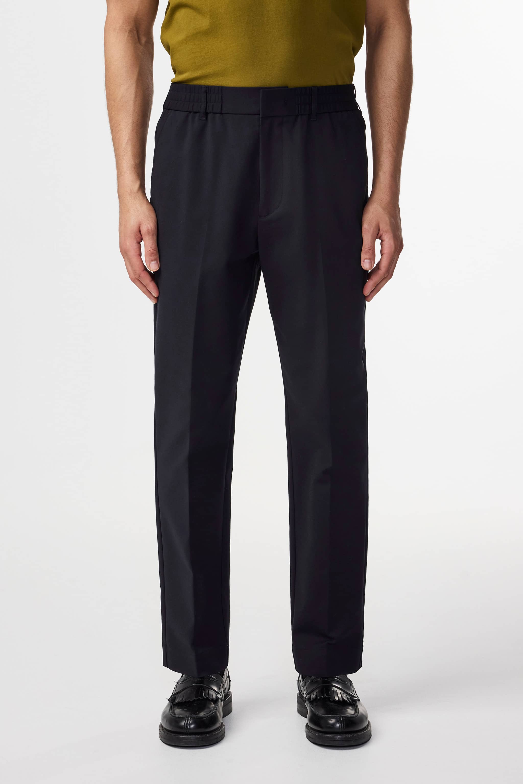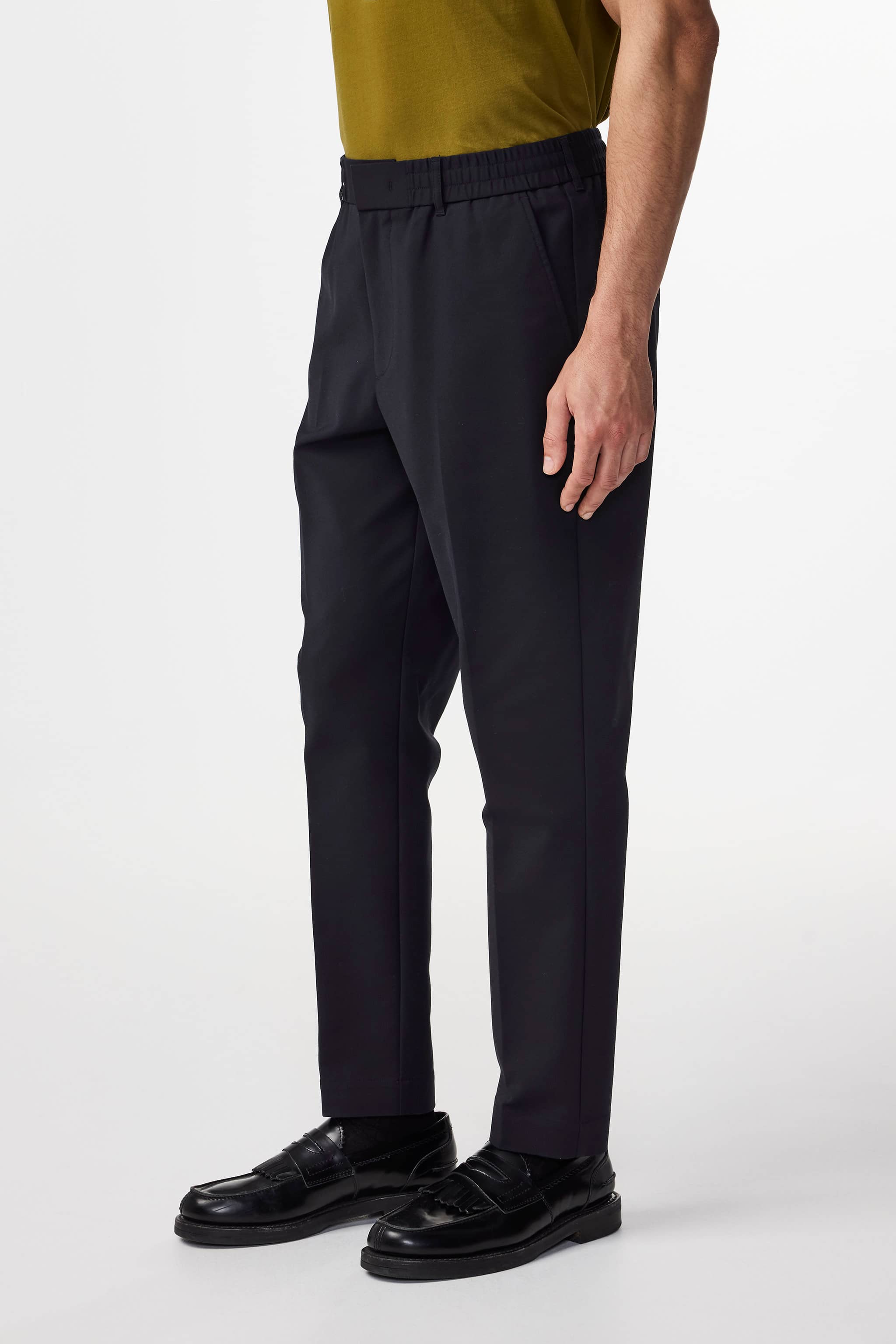 Versatile casual dress trousers with a tapered leg for a modern, streamlined look. The elasticated waistband with a hidden drawstring ensures a secure and comfortable fit, while the neat press fold adds a polished, sophisticated touch. Crafted from 350 g/m² Italian cotton blend fabric, these trousers offer subtle stretch for added comfort and durability, making them ideal for both casual and semi-formal occasions.