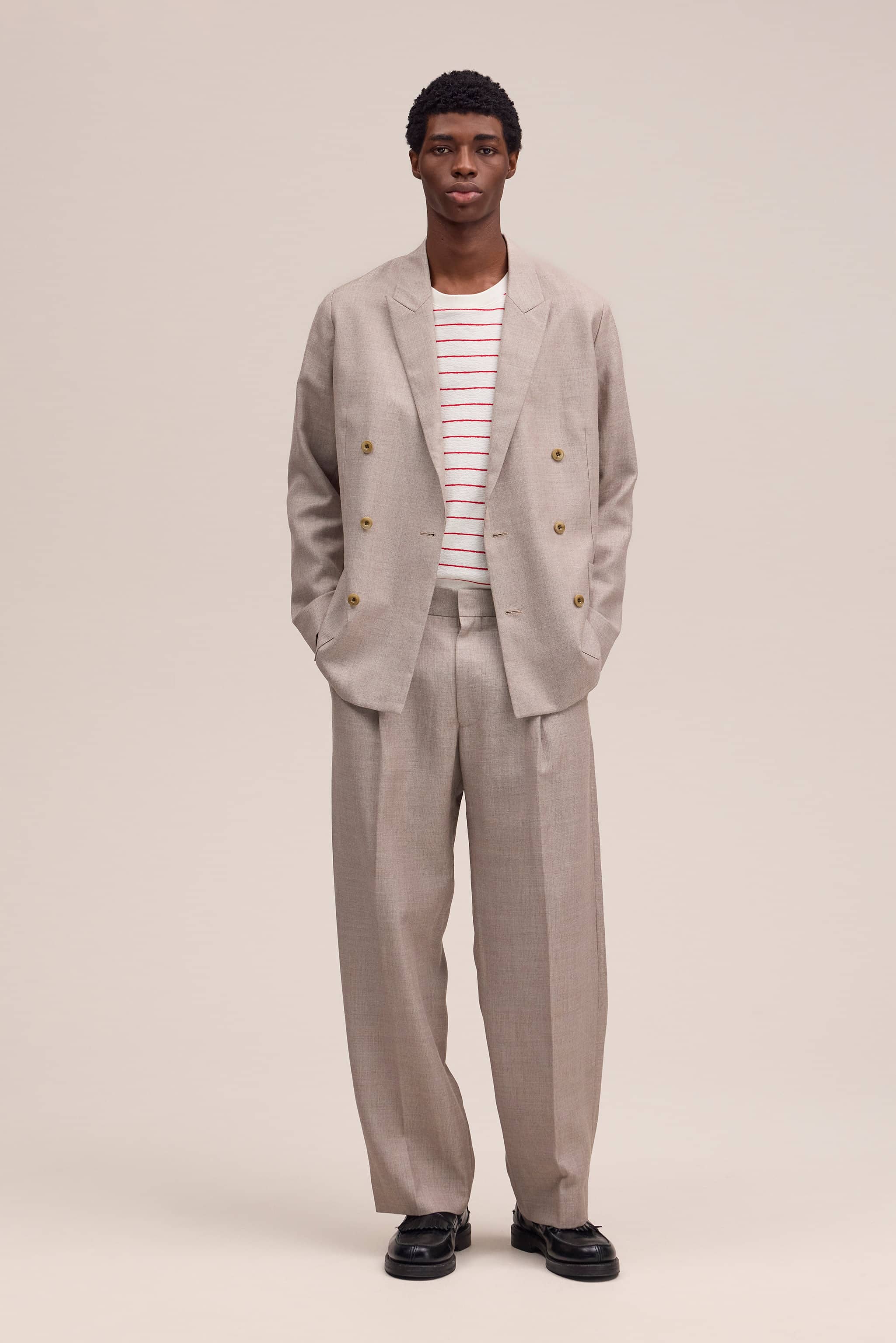 Tailored double-breasted blazer designed with a refined silhouette, crafted from a luxurious blend of wool and linen. Featuring patch pockets and a revers collar, this light summer tweed piece combines a soft, woolen hand-feel with a sophisticated aesthetic.