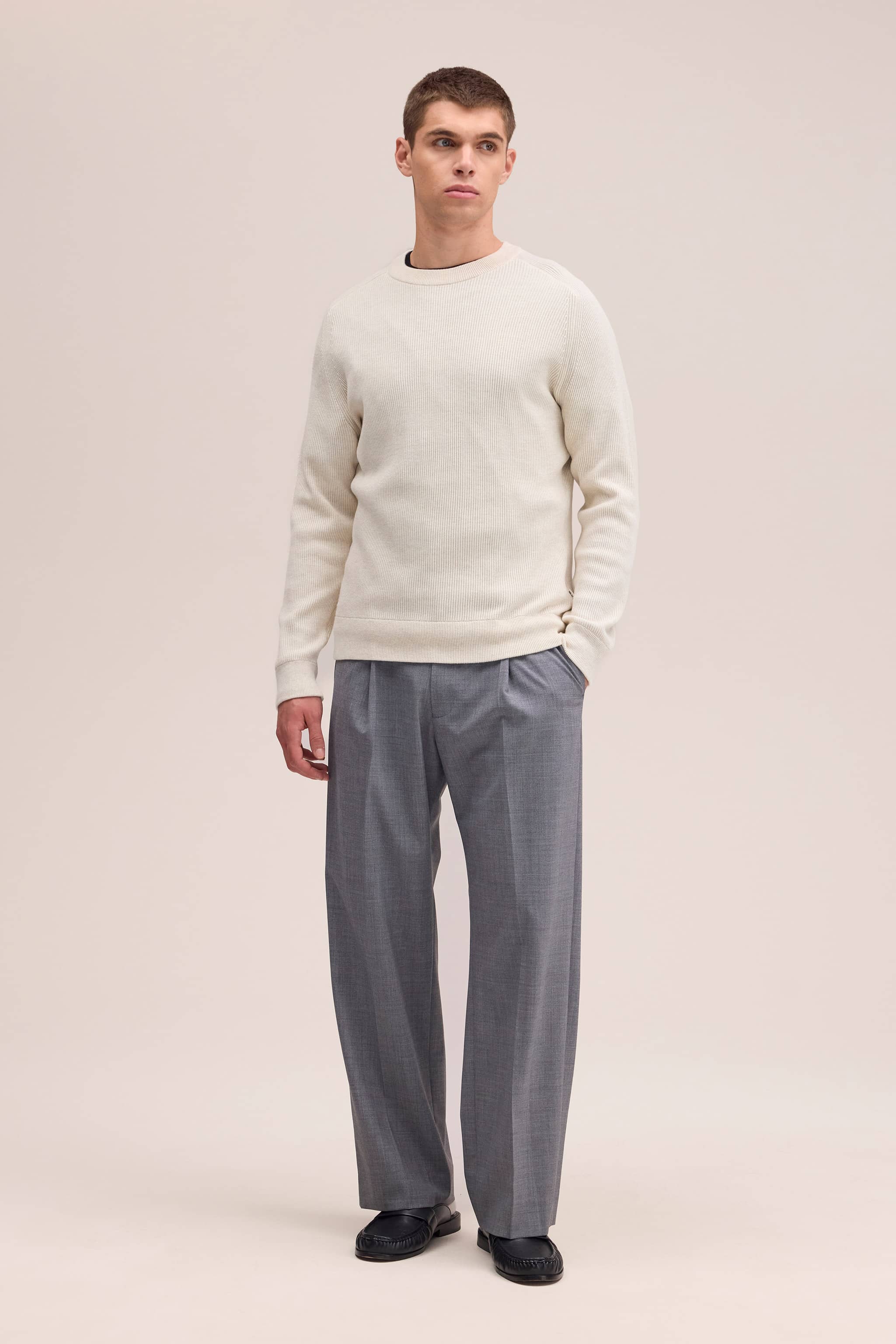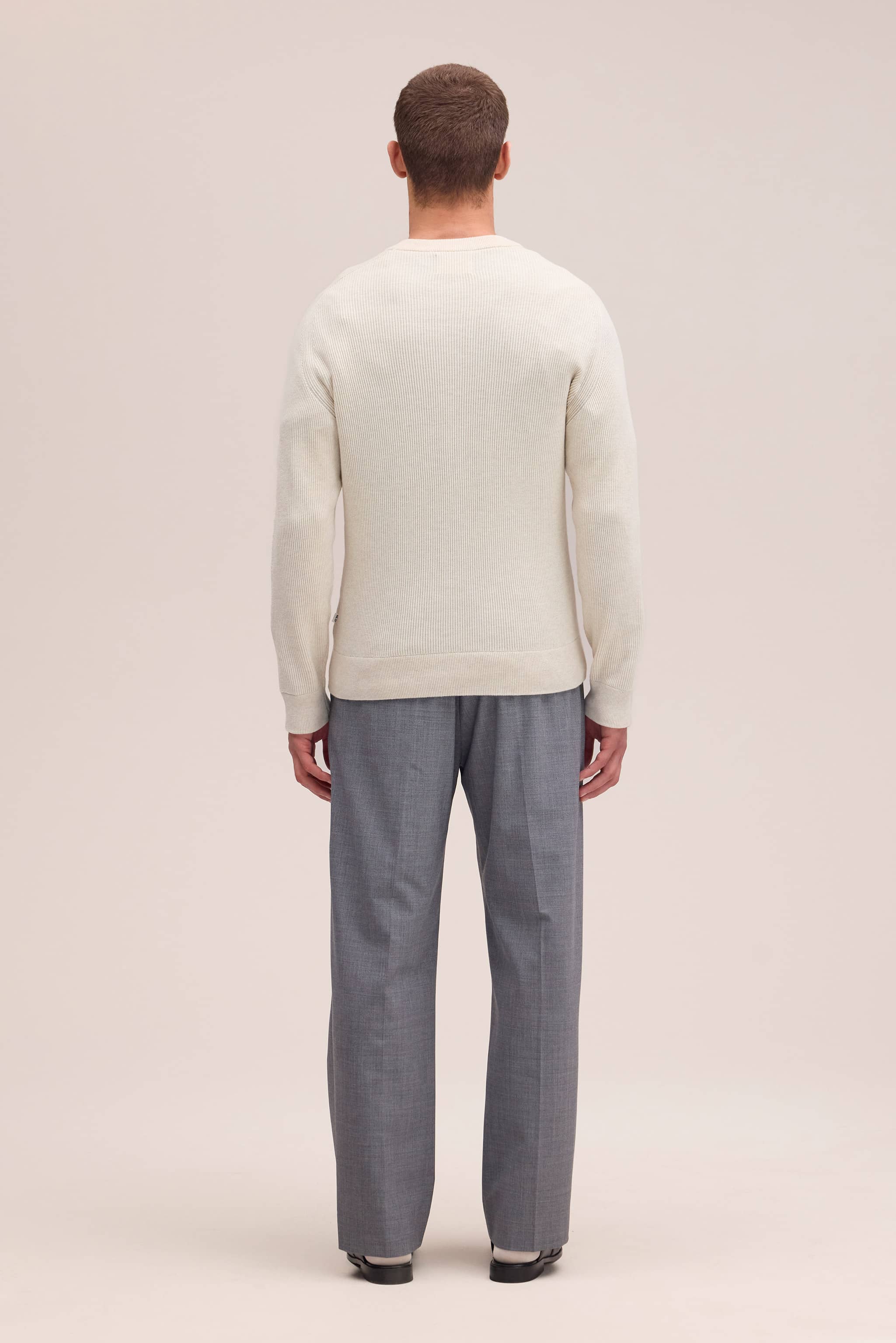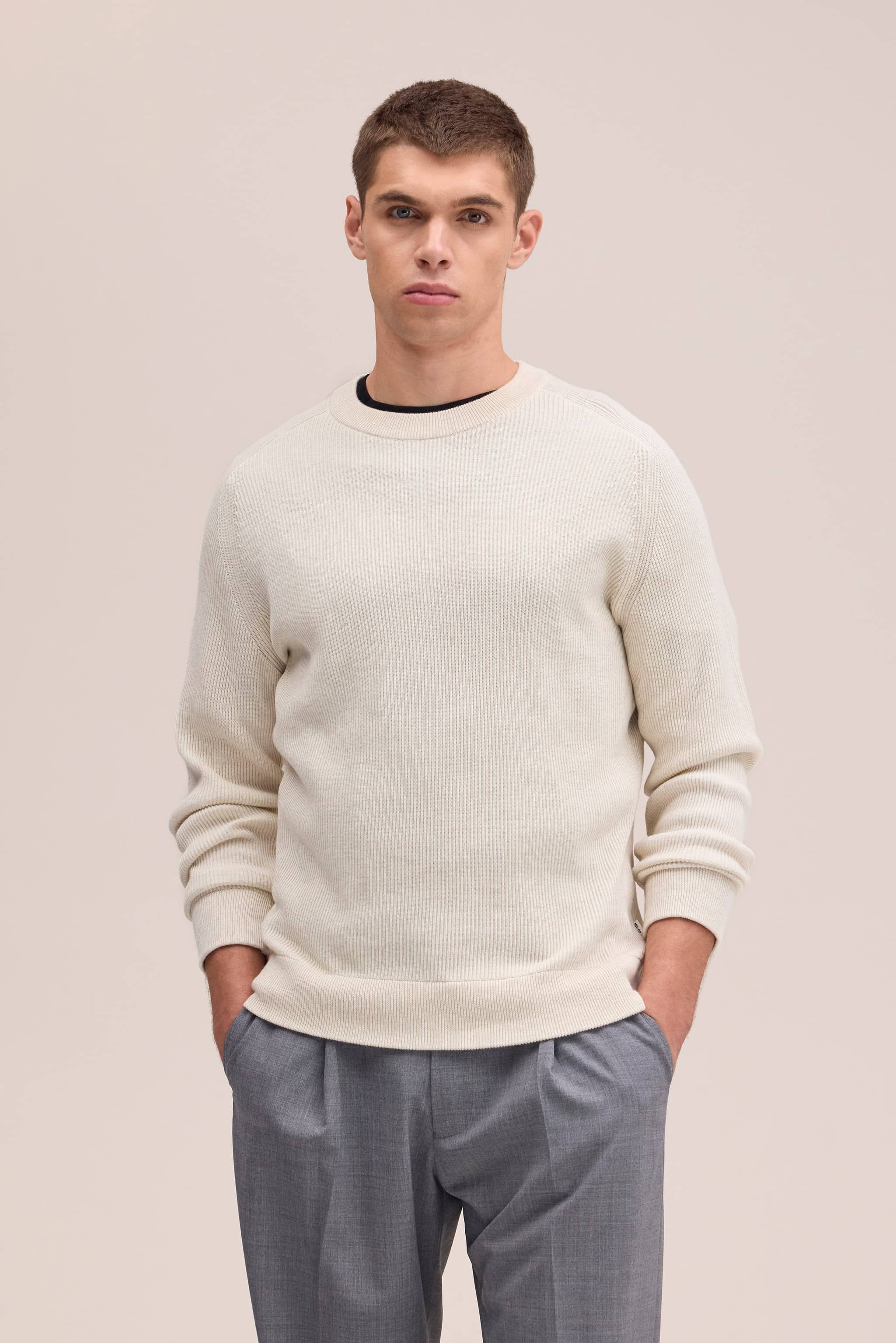 Crew neck sweater crafted in soft organic cotton with a distinctive ribbed texture throughout. Features classic saddle sleeves and offers a lightweight, comfortable feel perfect for layering or wearing on its own.