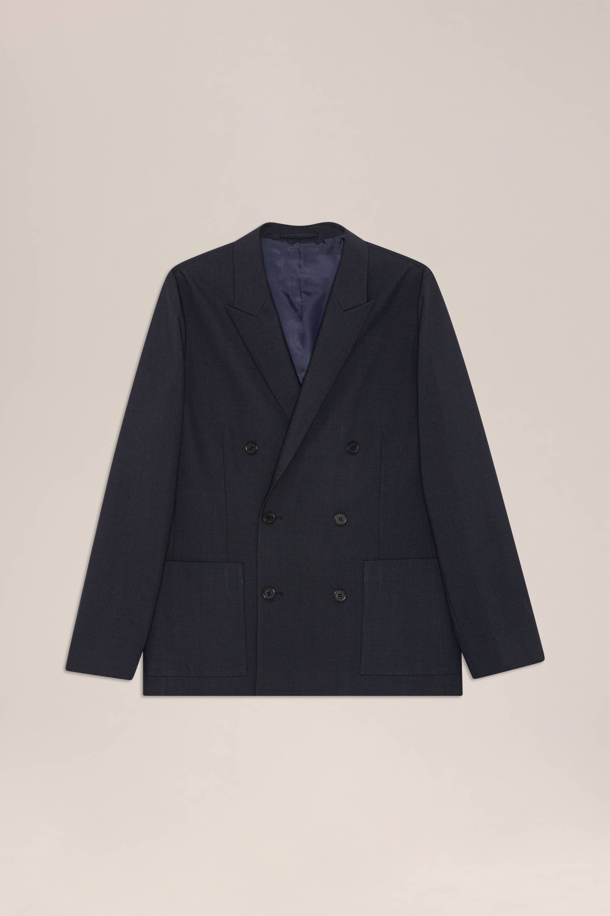 Tailored double-breasted blazer designed with a refined silhouette, crafted from a luxurious blend of wool and linen.