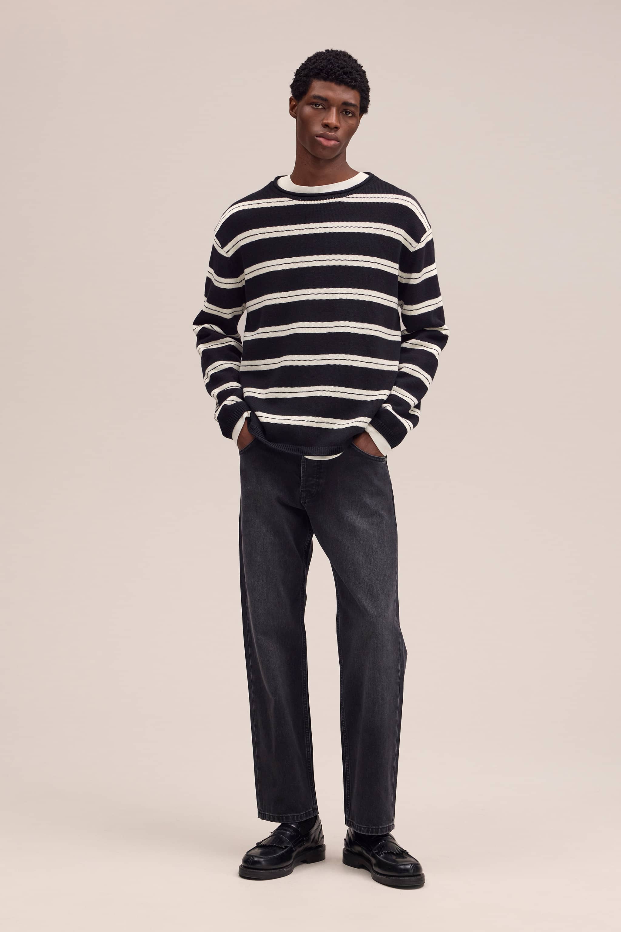Relaxed, stone washed straight-leg jeans, crafted from sturdy 13.50 oz midweight cotton denim.