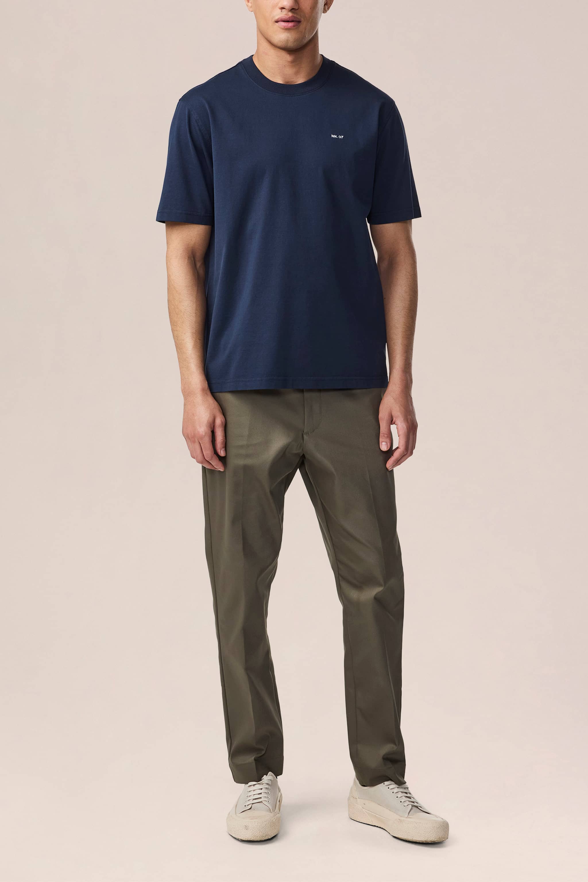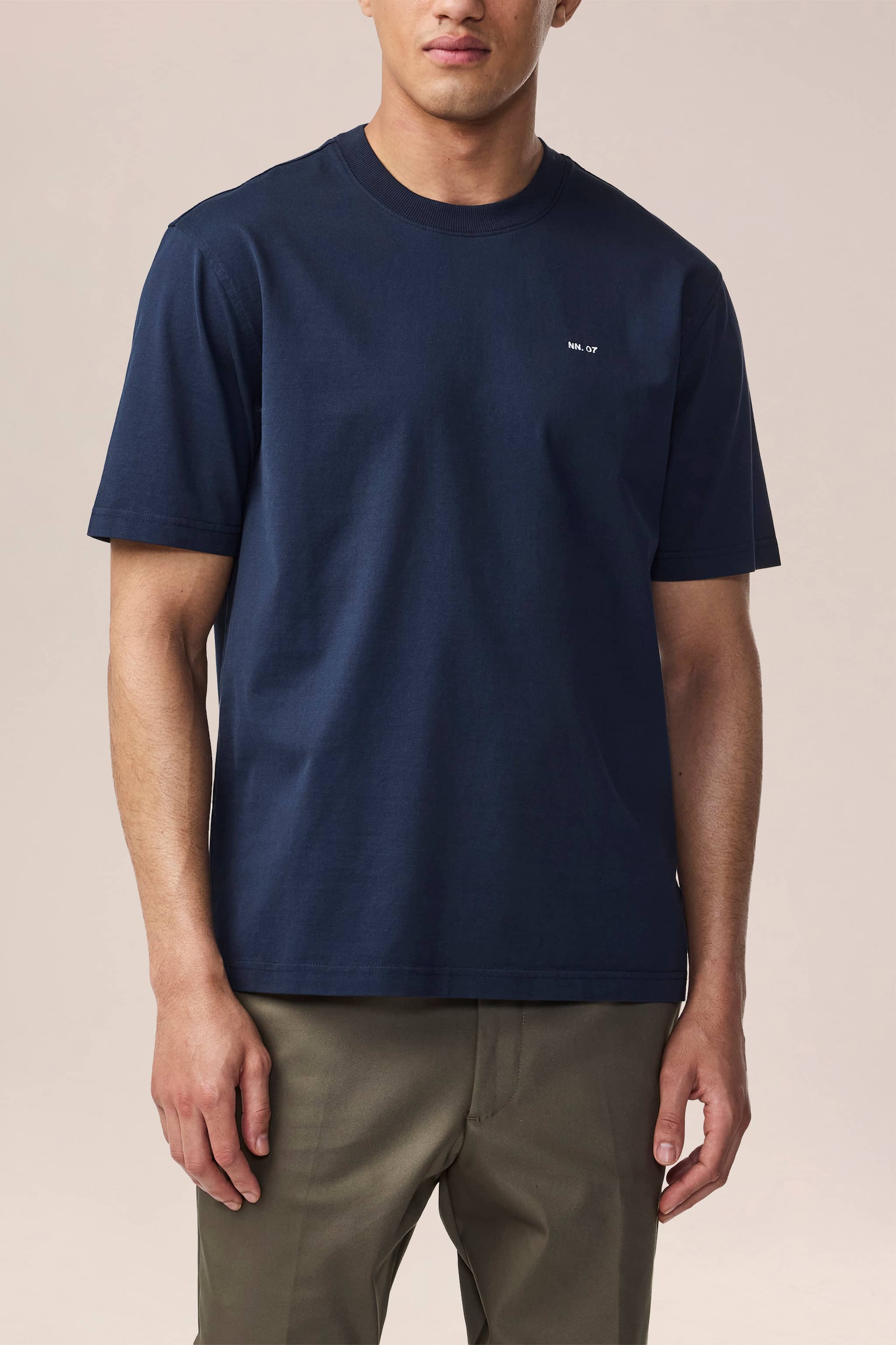 T-shirt med normal passform i mjuk single jersey av kammad bomull för en slät och andningsbar känsla. Designad med ribbad hals och synliga sömmar över axlarna.