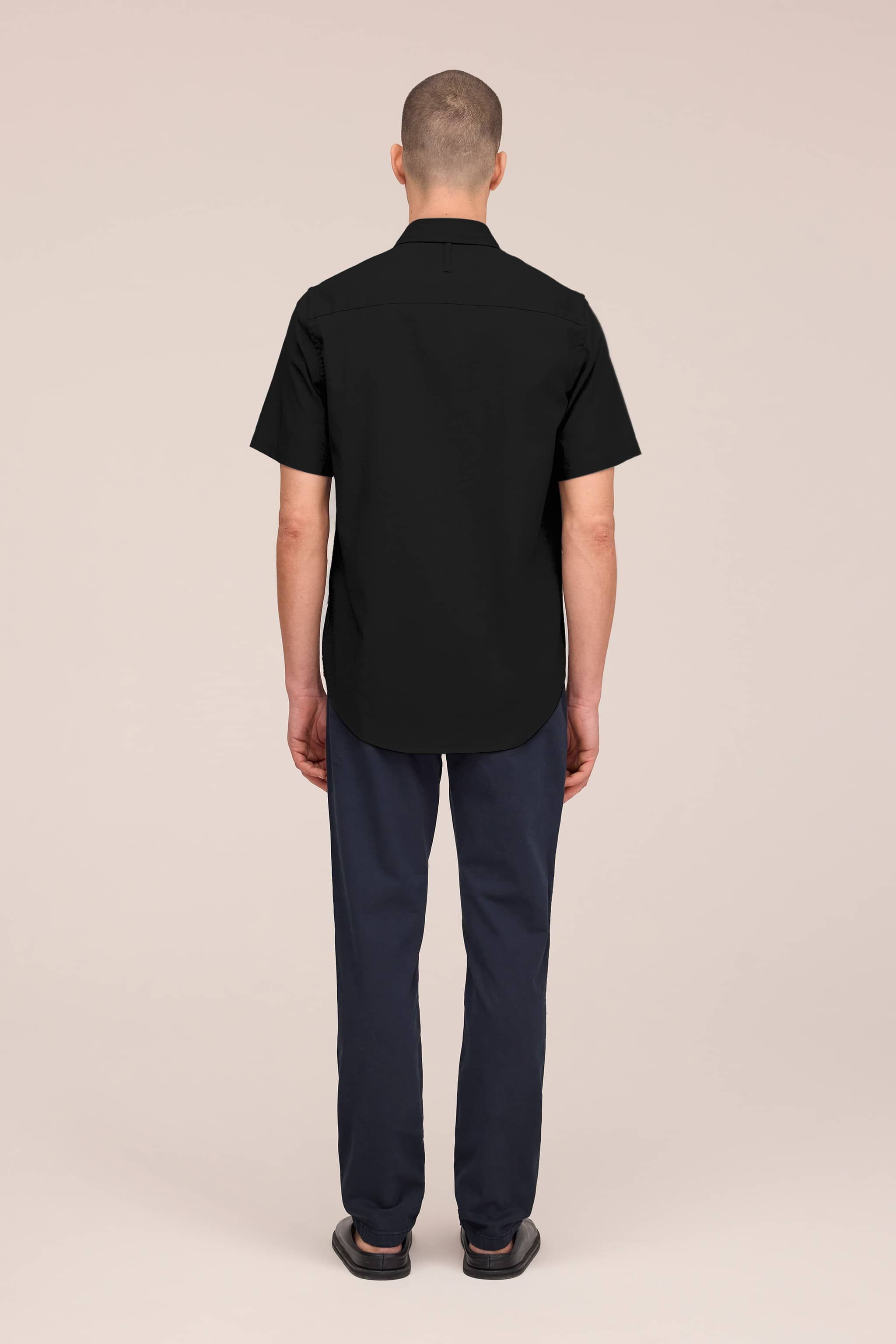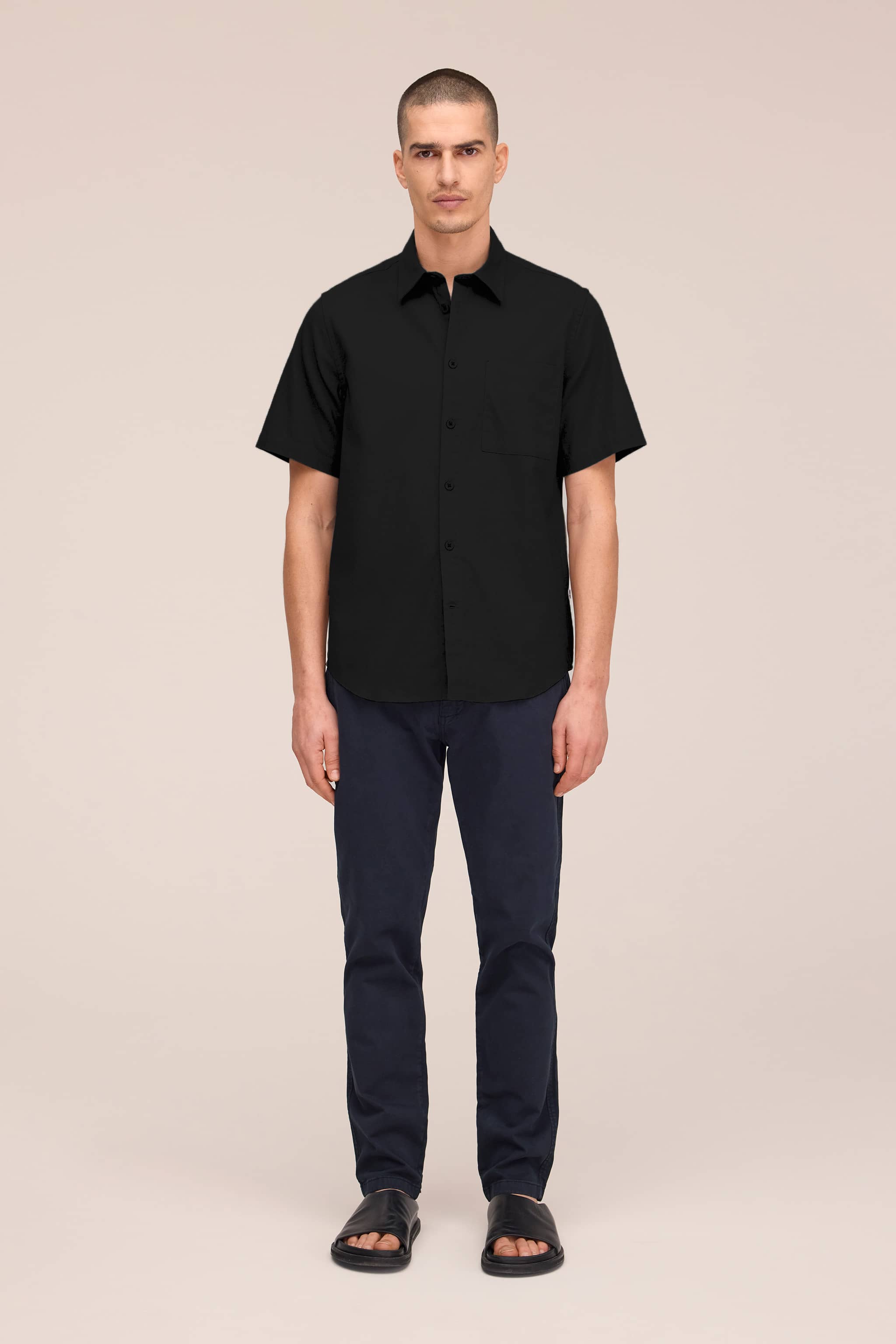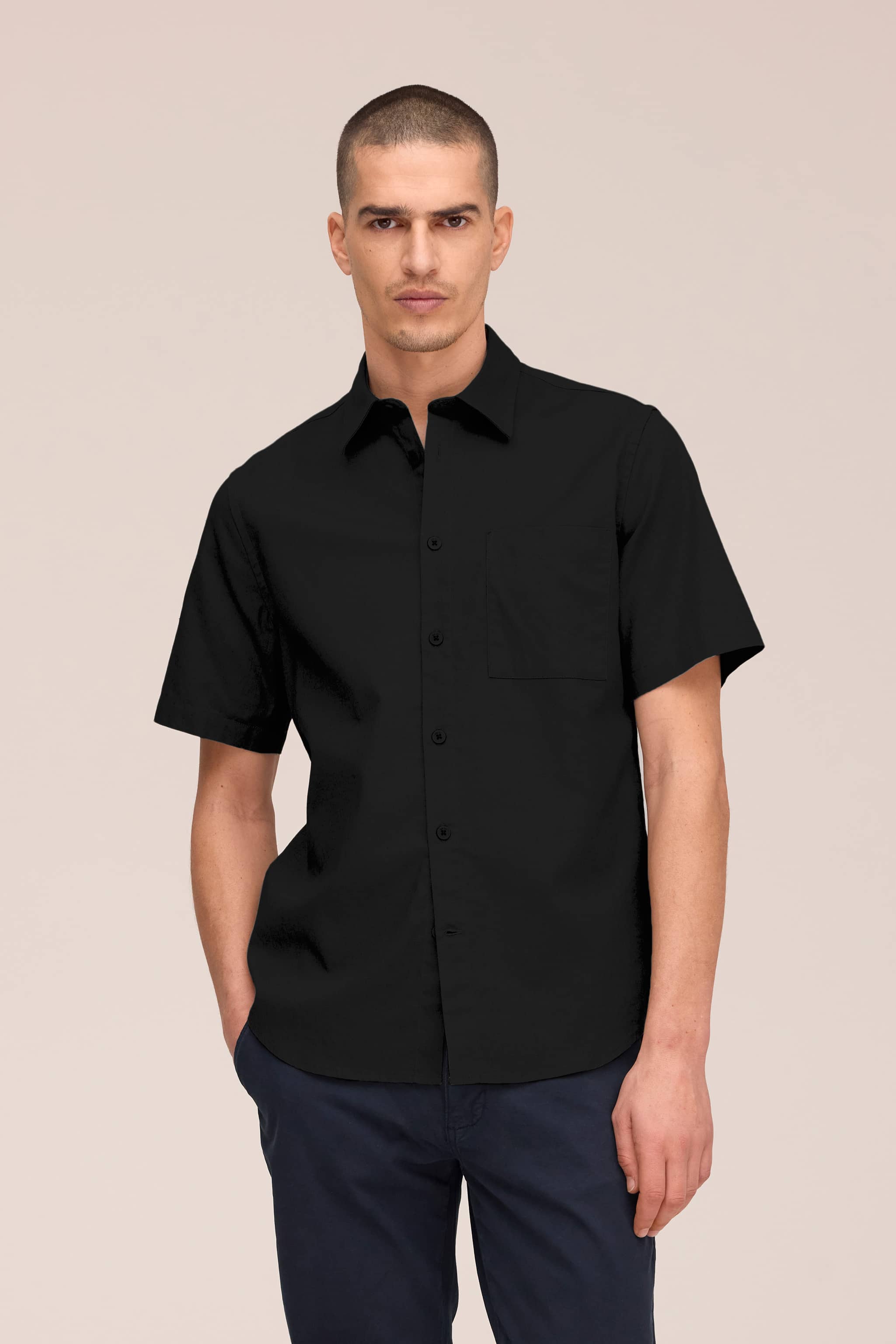 Short-sleeved button-down shirt crafted from a breathable cotton and linen blend. Features a square chest patch pocket and branded NN07 logo buttons.