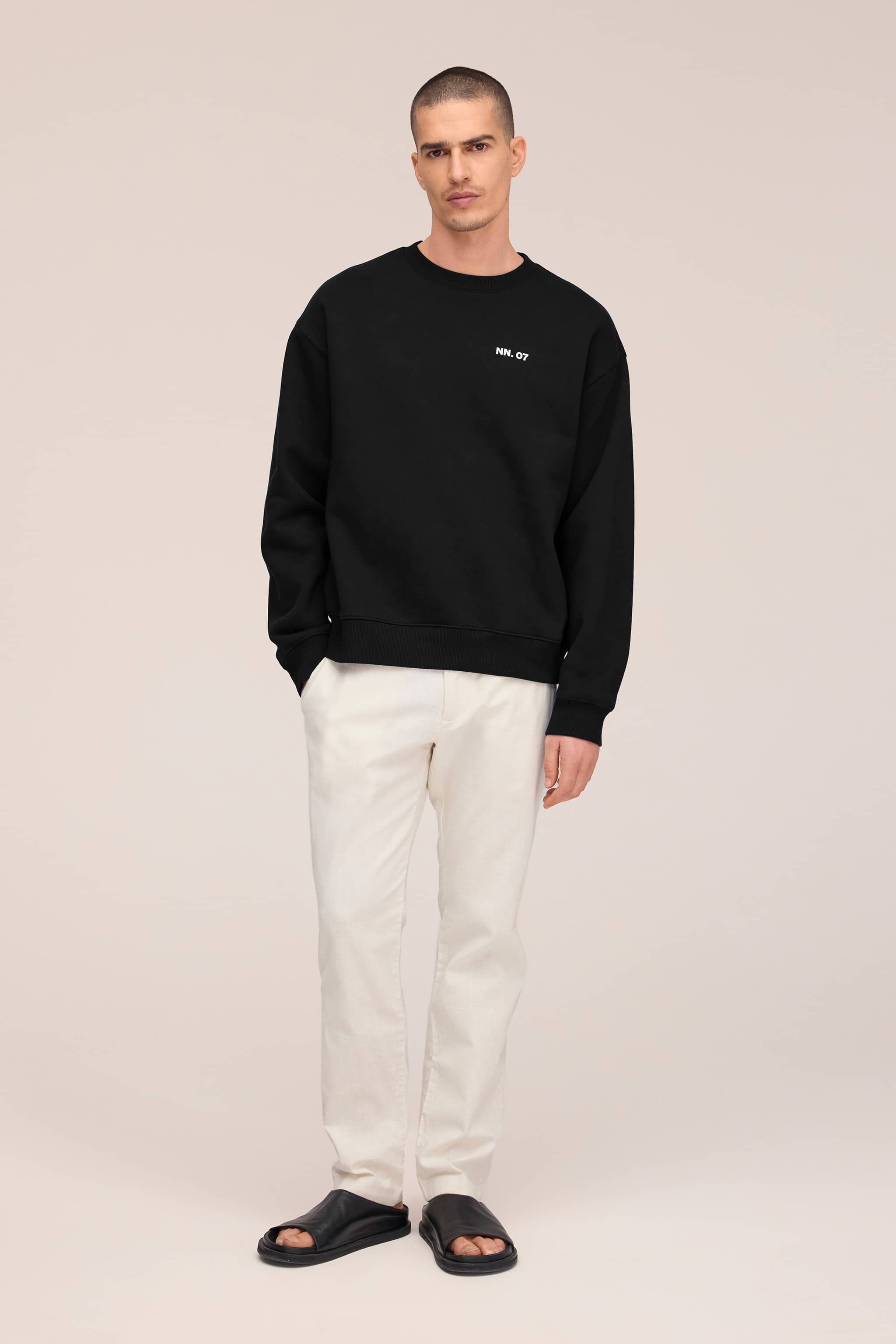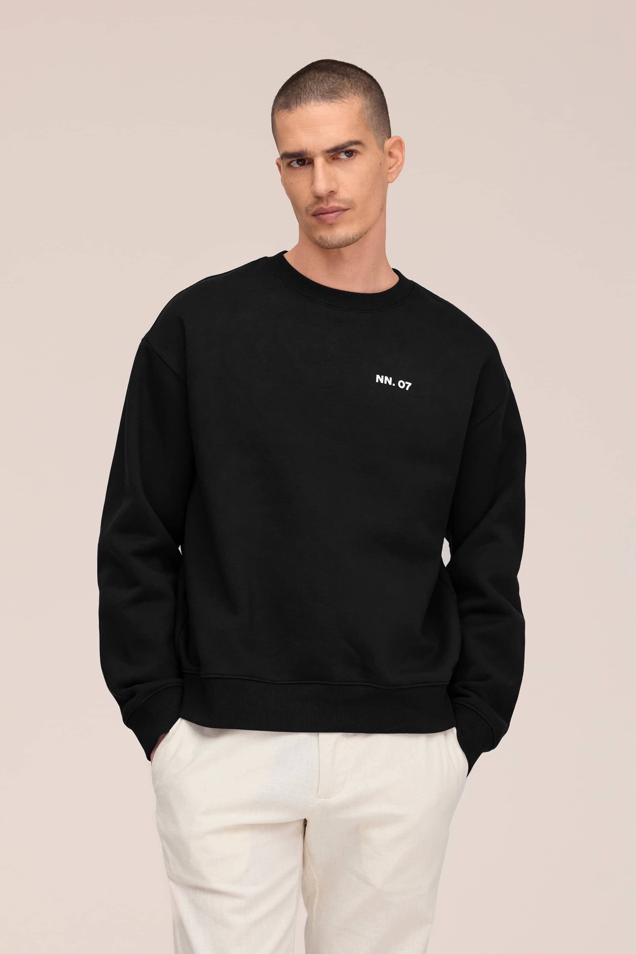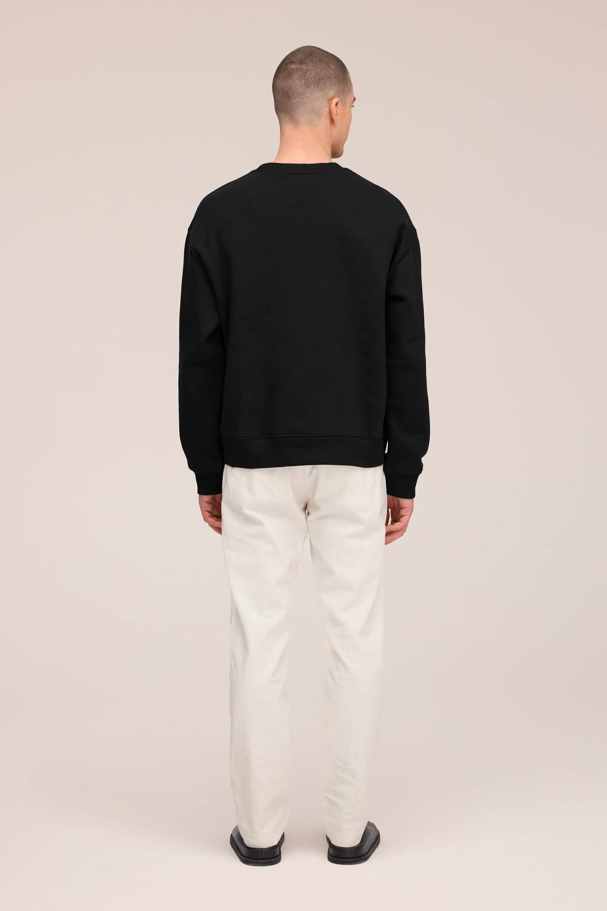 Klassisk rundhalsad sweatshirt i slät ekologisk bomullsblandning, diskret dekorerad med logotyp på bröstet.