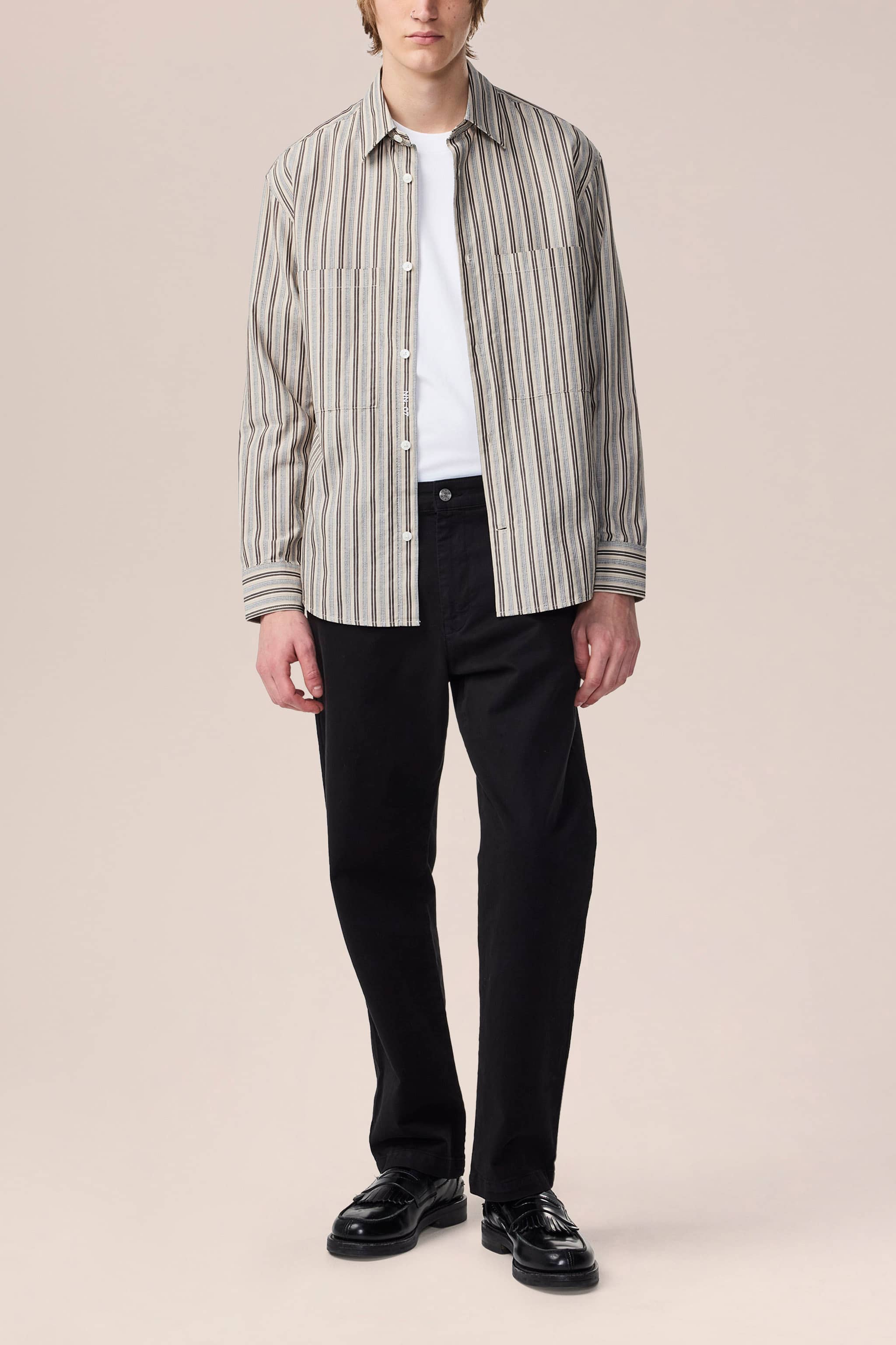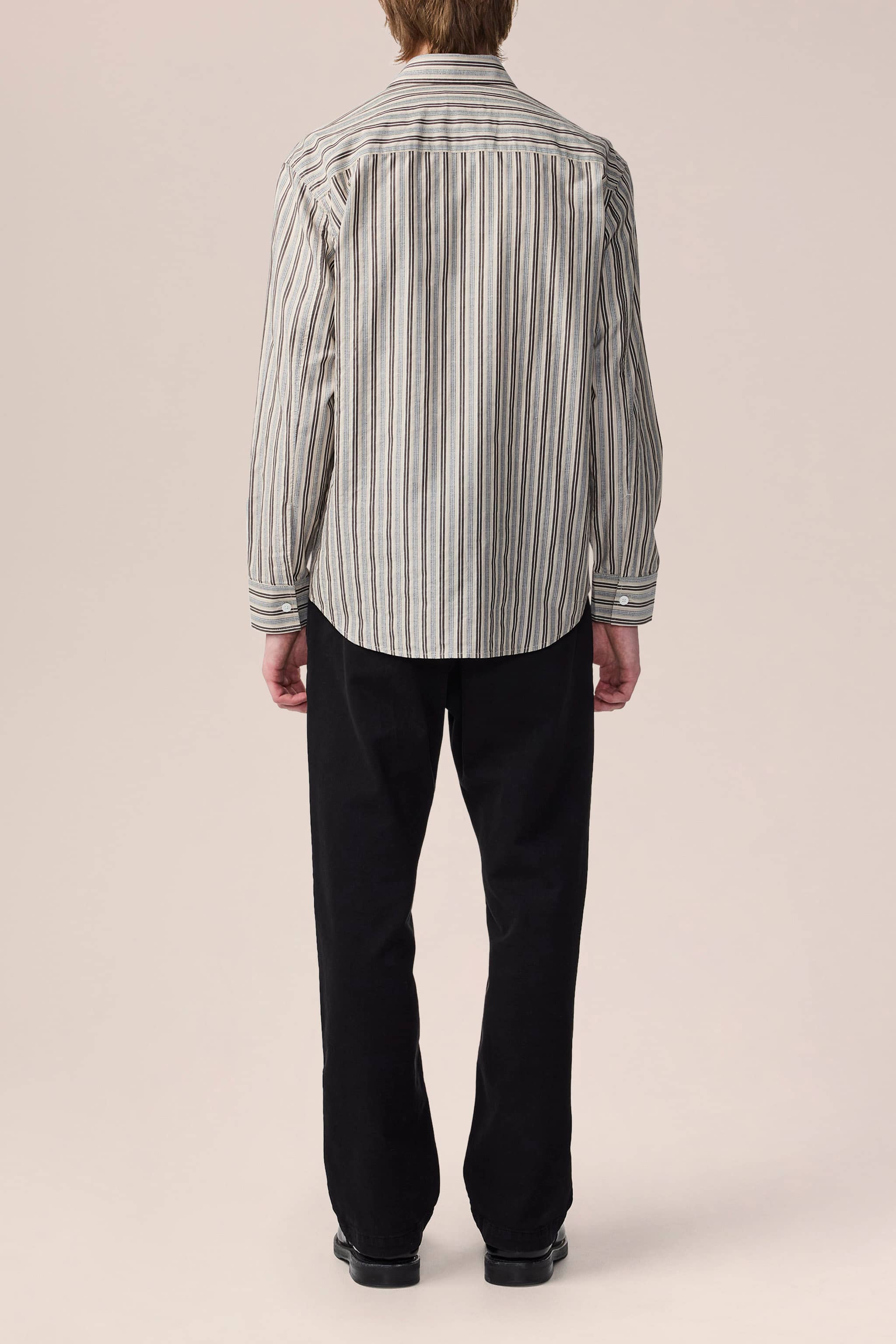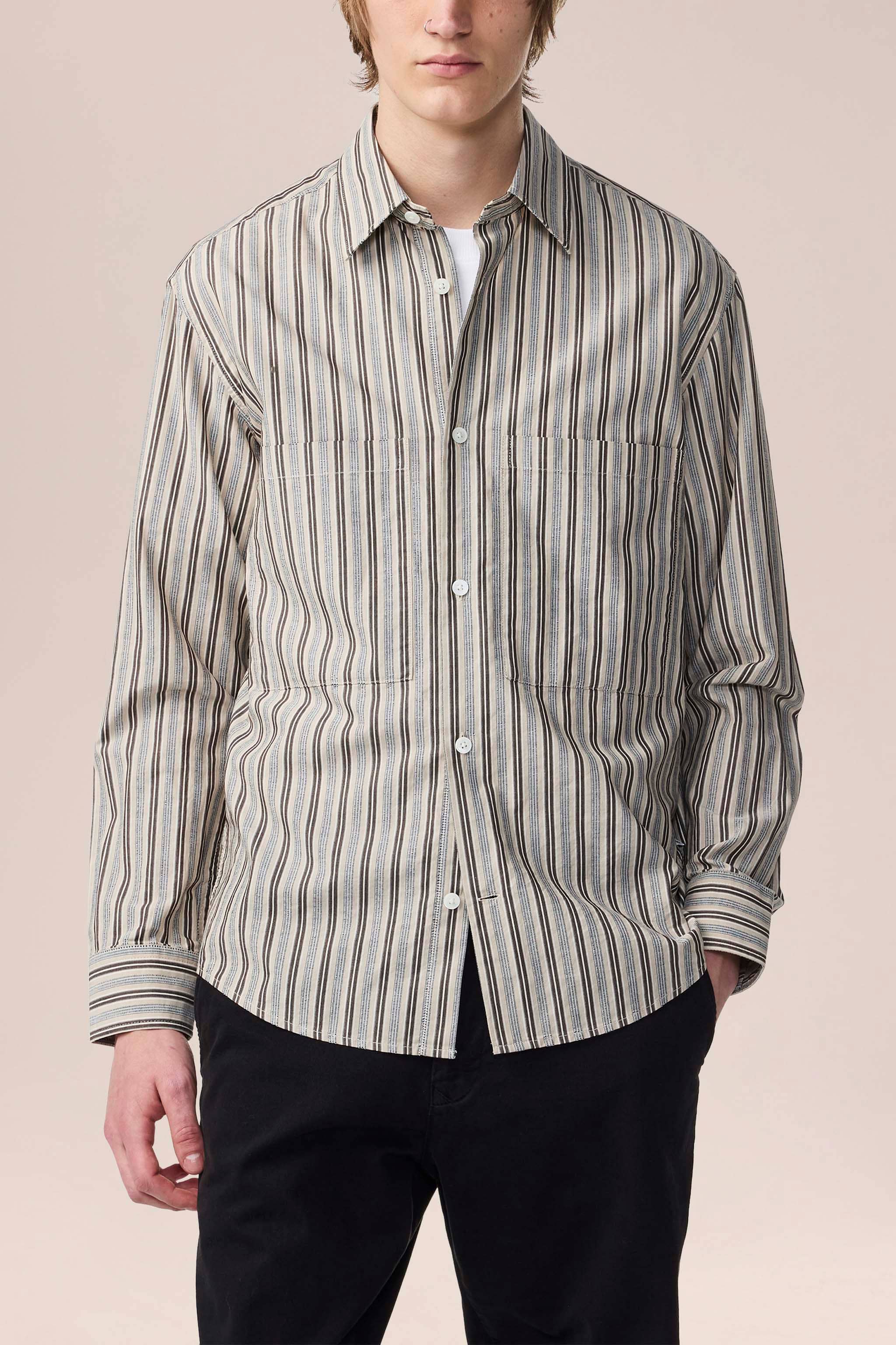 Lätt, slät skjorta av bomull, vävd i en färgad rand av garn. Skjortan har workwear-inspirerade fickor med lock och knappar i pärlemor.