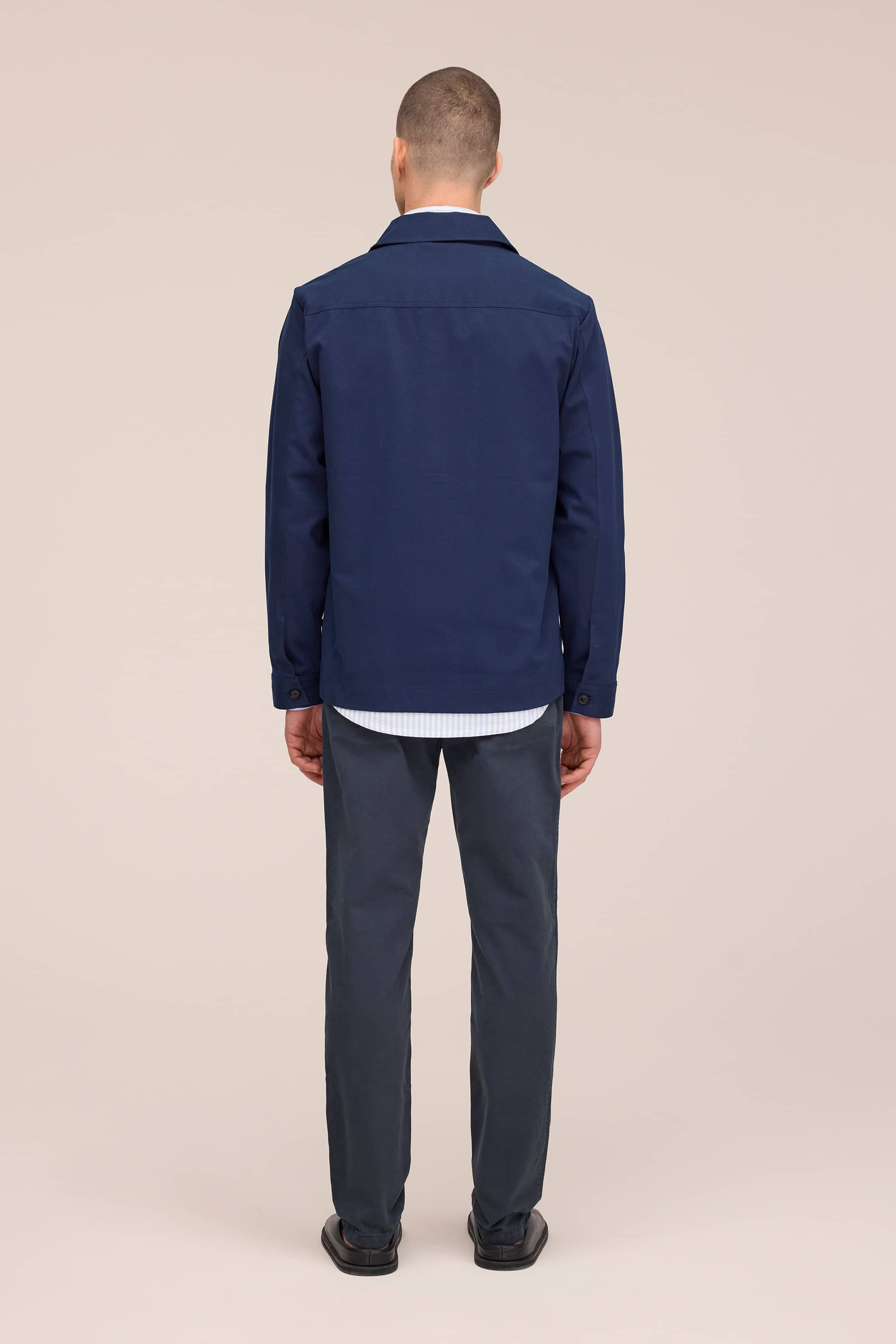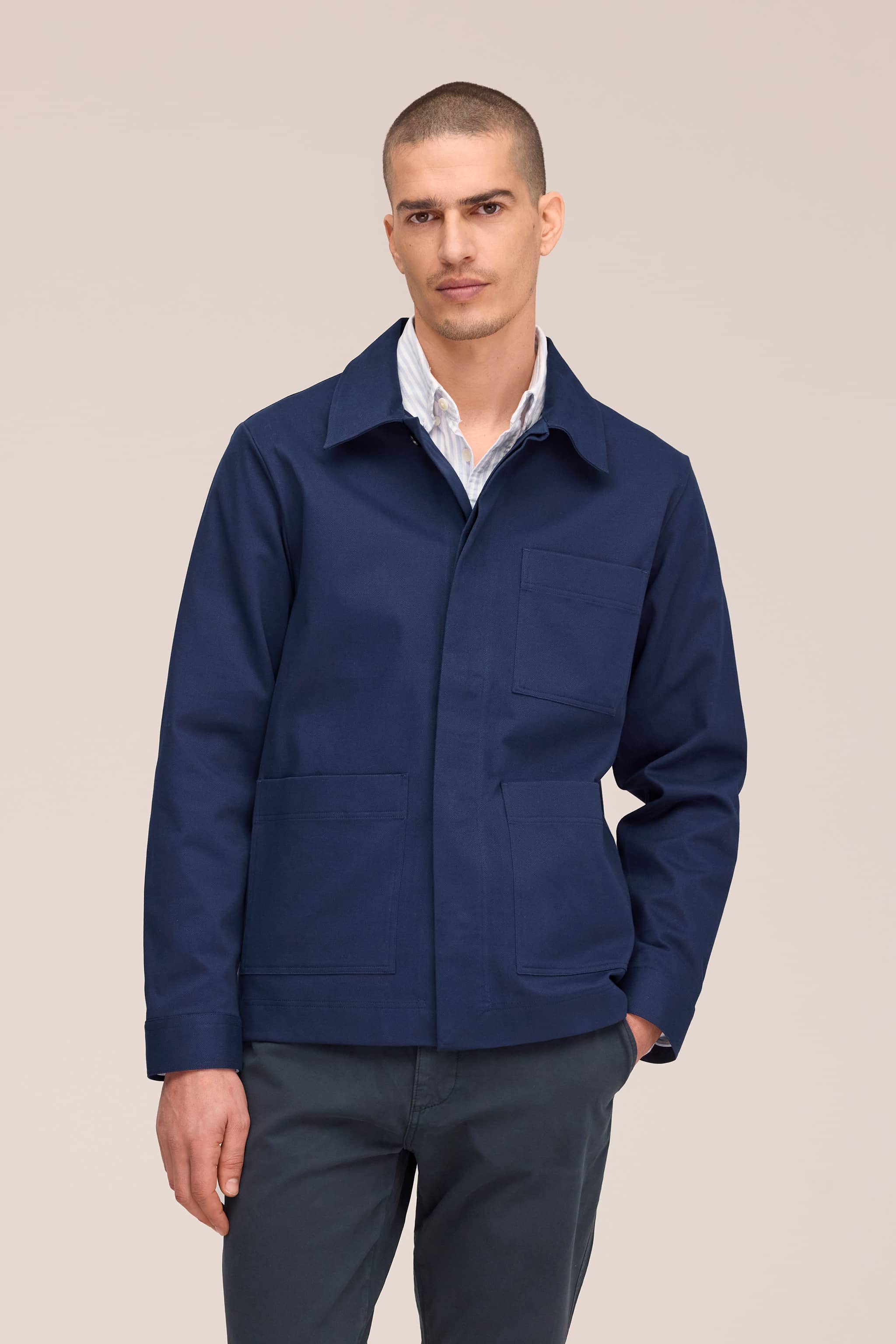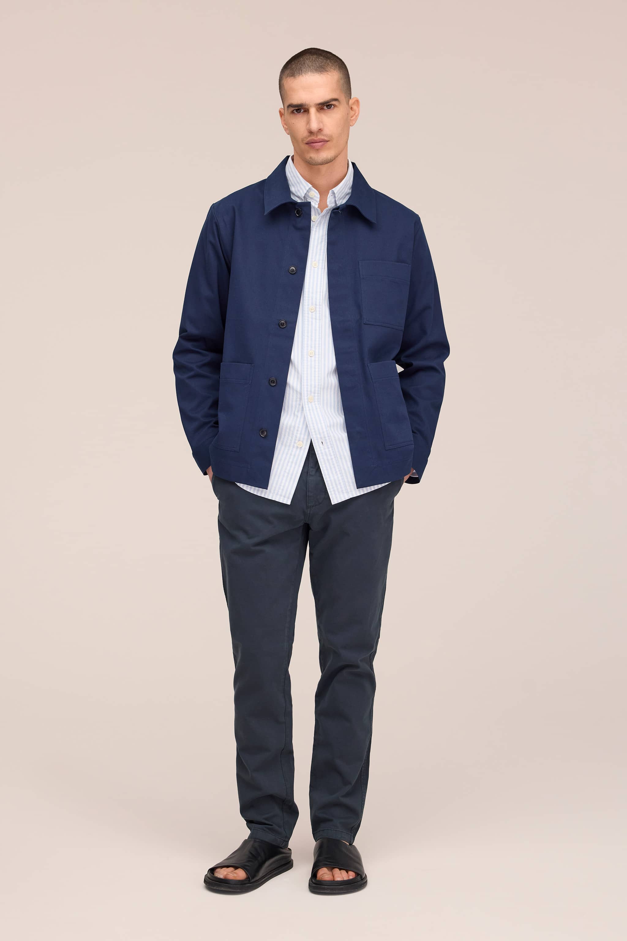 Workwear-inspired overshirt crafted in organic cotton. Designed with a soft collar, a single chest pocket, and twin patch pockets at the waist.