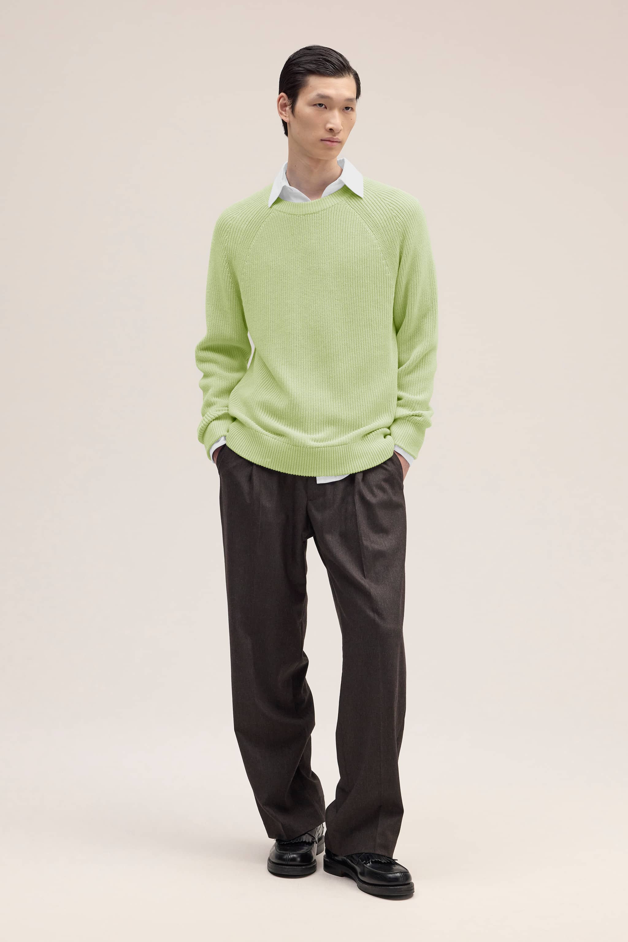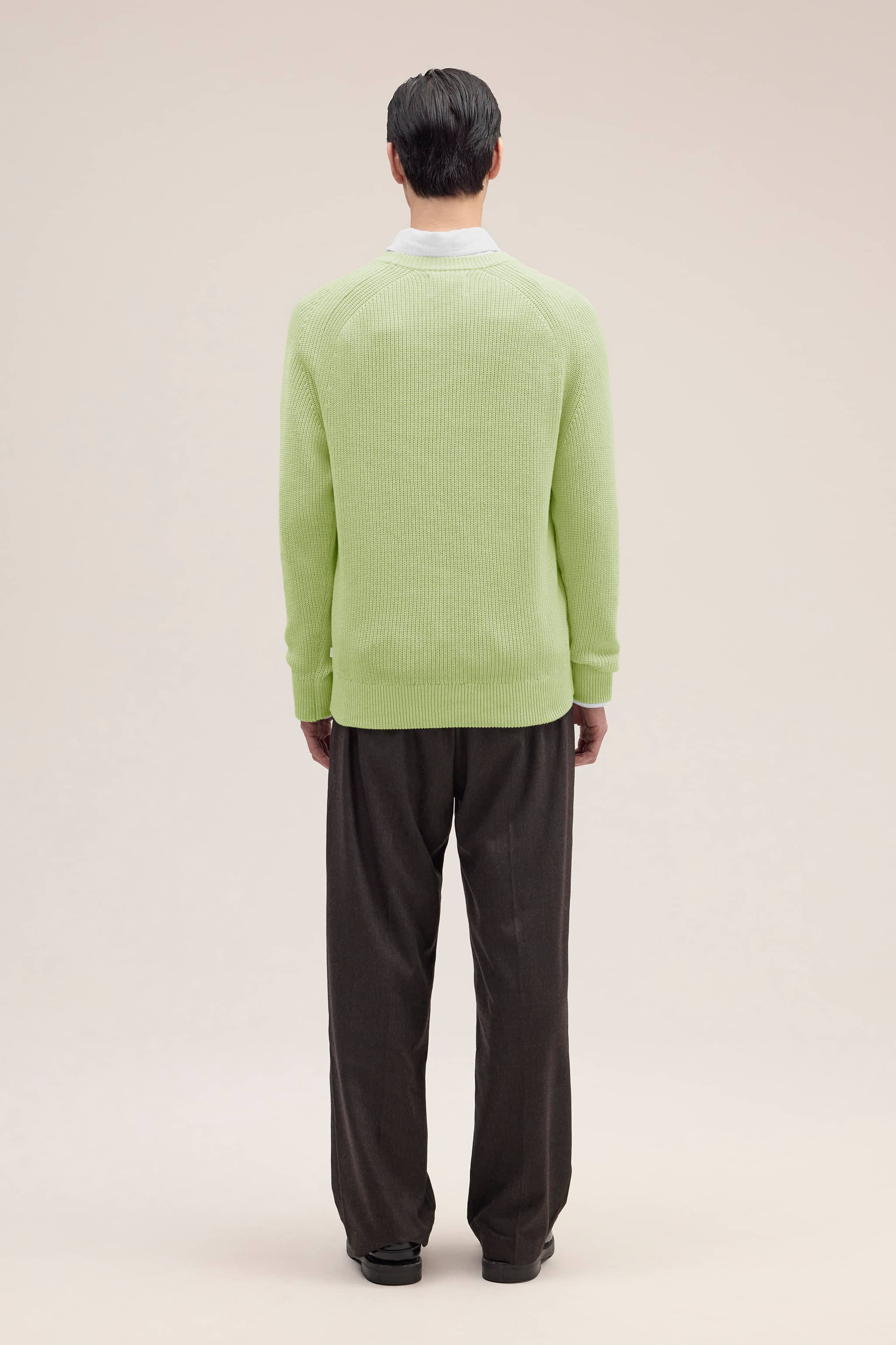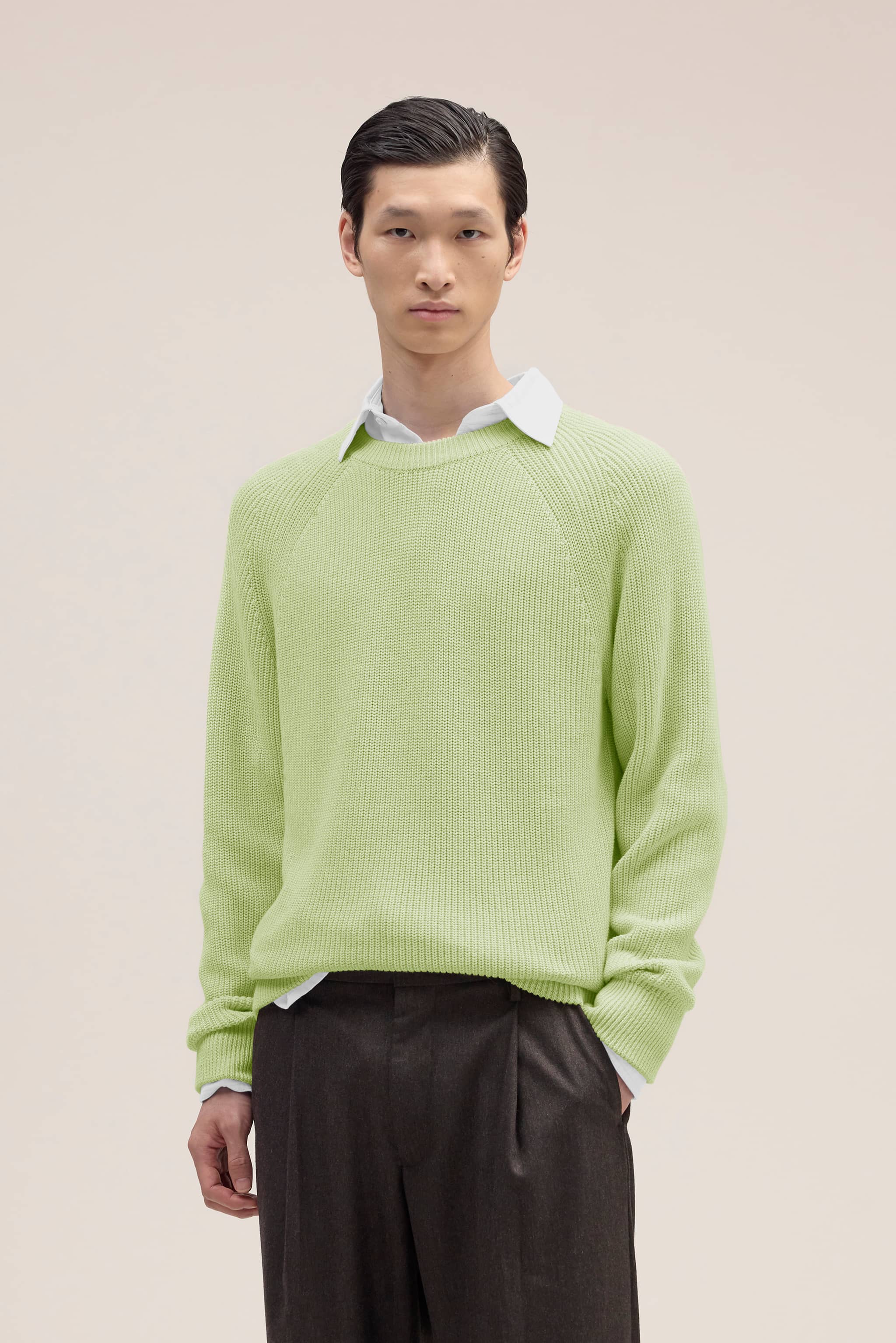 Tröja med rund halsringning med en genomgående ribbning som är tillverkad av ett lent bomullsgarn.