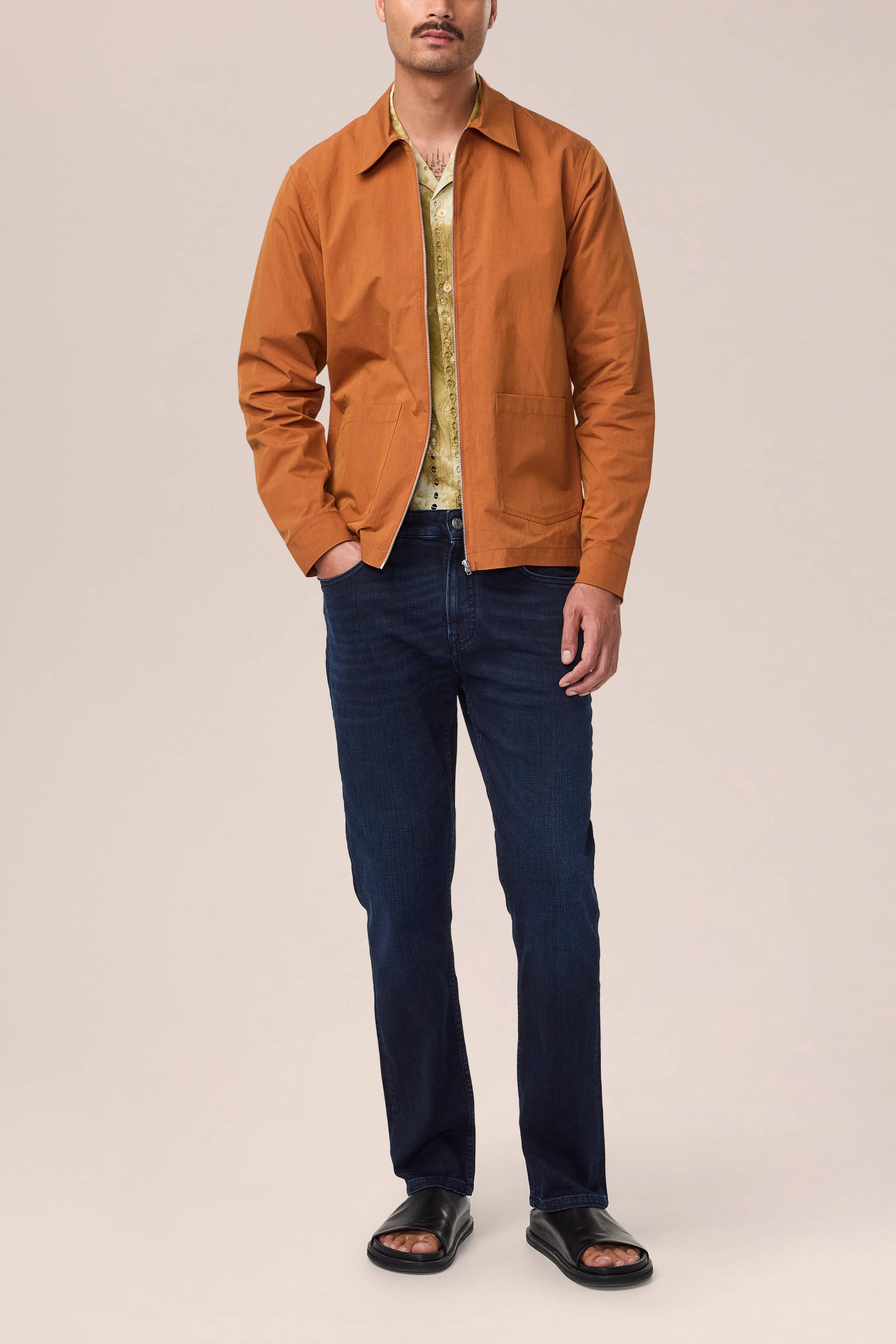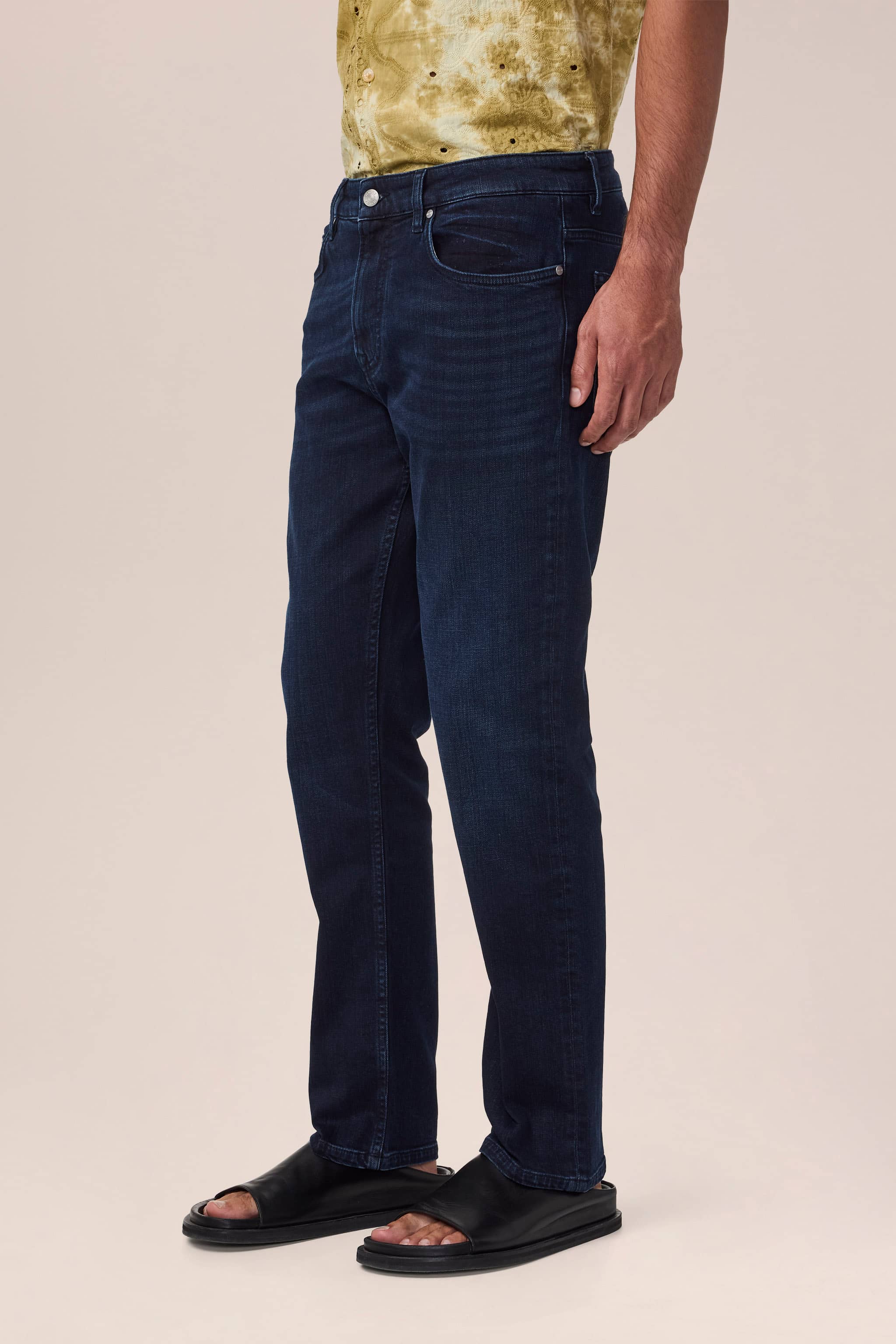Dark blue jeans cut in a straight silhouette. Crafted in a BCI-sourced cotton denim with a touch of stretch for comfort. Adorned with a silver top button and matching rivets. Better Cotton Initiative is a non-profit that promotes a healthier standard for growing cotton globally.