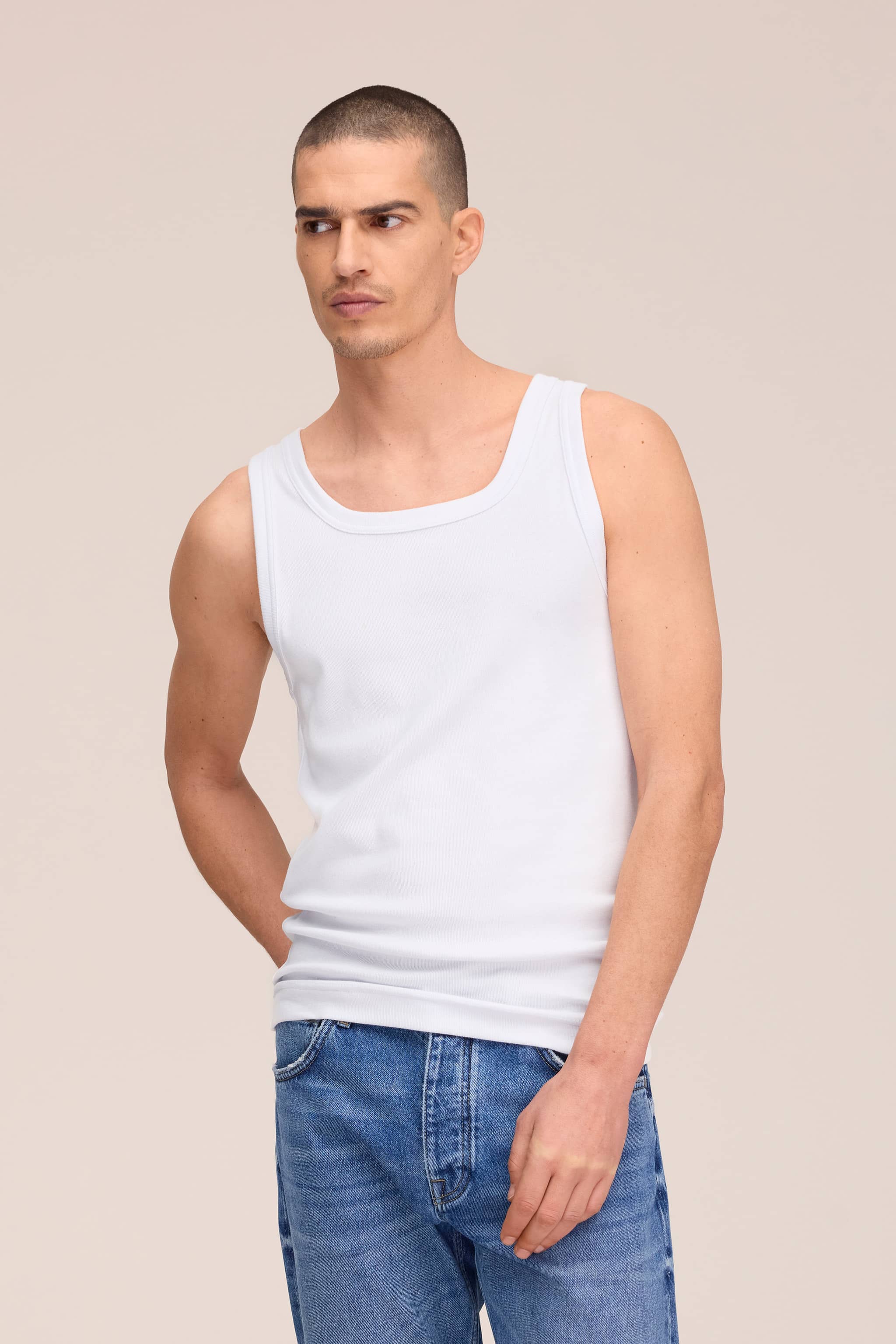 Linne av ekologisk bomullsblandning med en känsla av stretch. Designad i ett 2x2 ribbat tyg med single jersey-bindningar i halsringning och ärmhål.