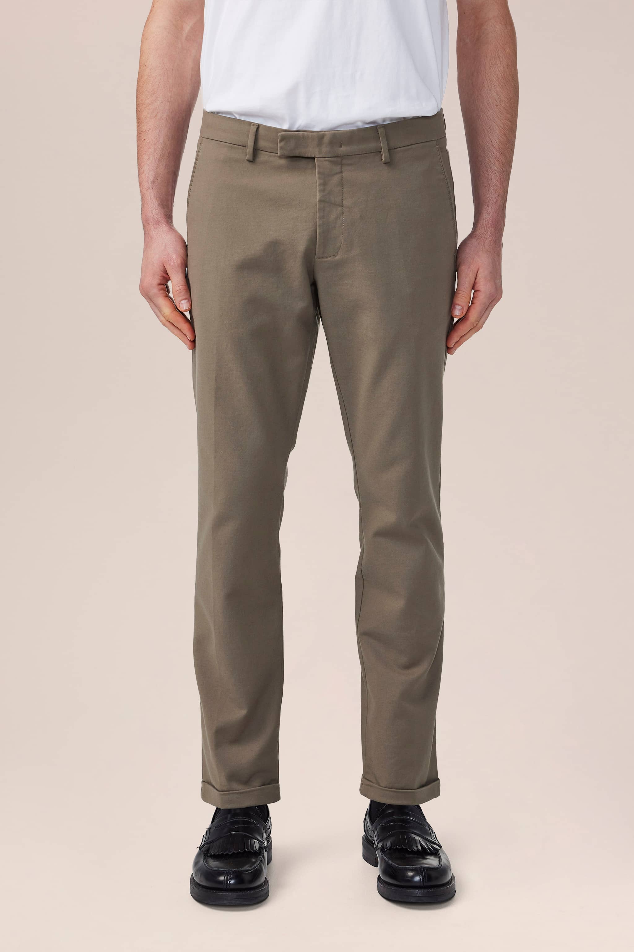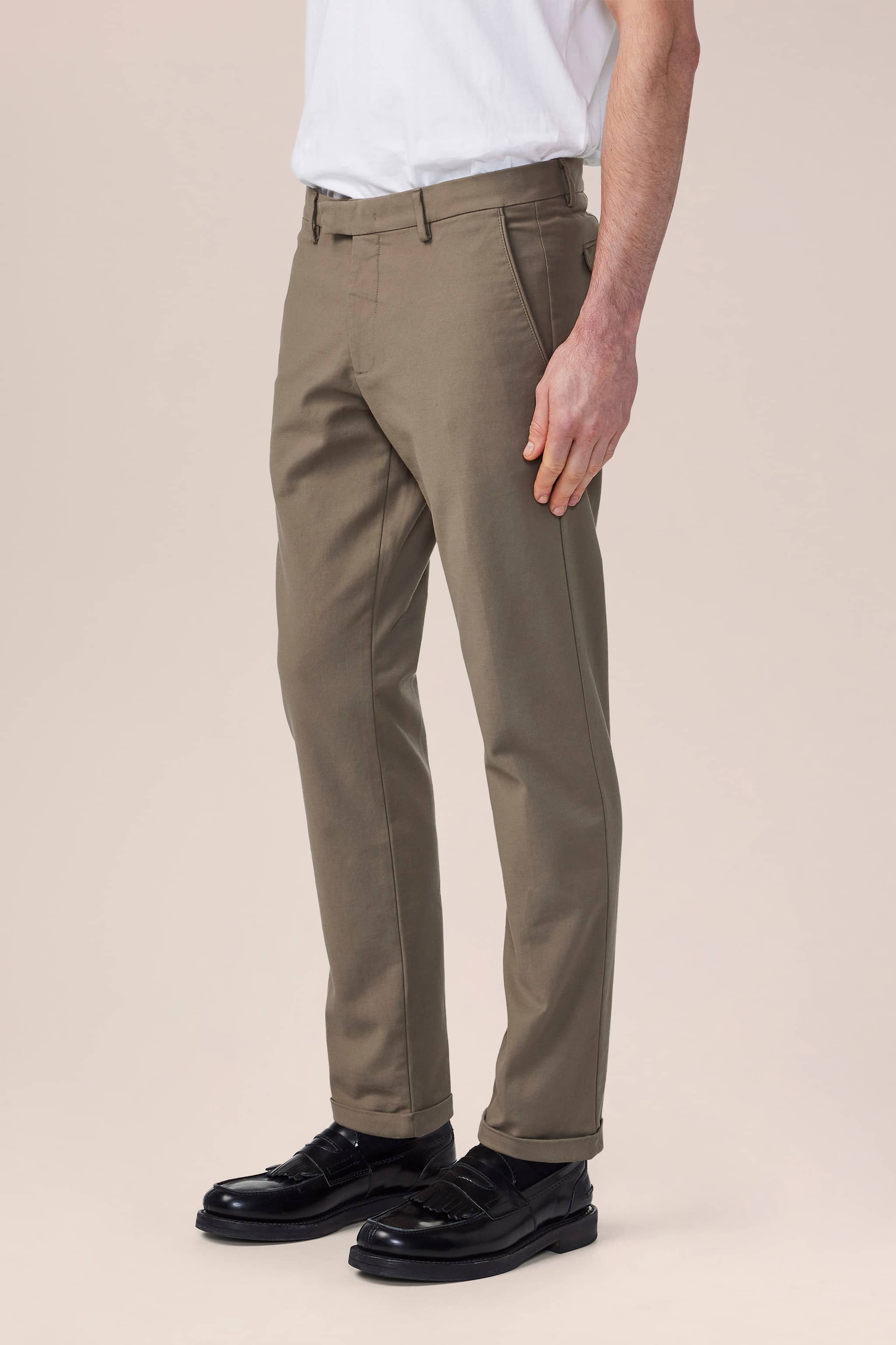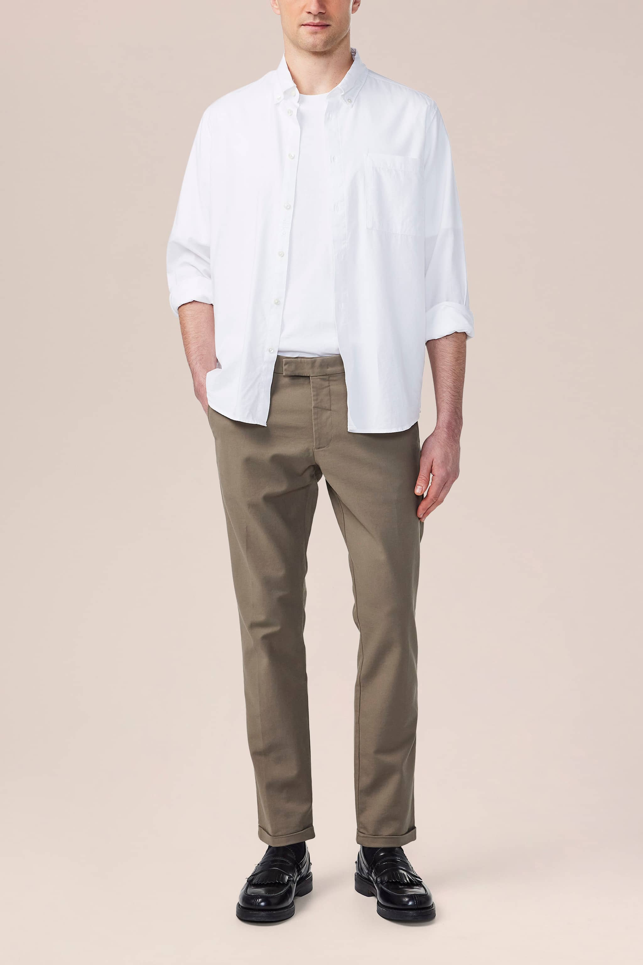 A sartorial trouser made in a soft BCI sourced cotton blend from Italian mill Tessuti Pordenone. Designed with an Italian Cobrax hook, contra button and zip-fly fastening for a sophisticated finish. Details include back button pockets and one-inch rolled cuffs. Better Cotton Initiative is a non-profit that promotes a healthier standard for growing cotton globally.